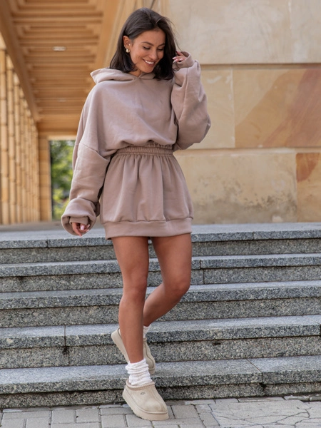 Dresowa bawełniana oversizowa SUKIENKA BLUZA kangurka z kapturem z gumką w pasie mokka X314 k01