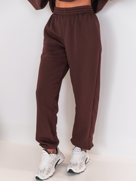 ( ilość produktów: 350 )Dresowe bawełniane SPODNIE z wysokim stanem luźny krój ze ściągaczami brązowe E341