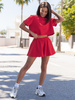 Zwiewny KOMBINEZON z krótkimi spodenkami i poduszkami na ramionach czerwony X124 k01