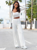 Codzienny KOMPLET top z kwadratowym dekoltem i luźne spodnie z szerokimi nogawkami z modalu o fakturze prążka ecru X12 k01