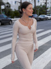 Codzienny KOMPLET bluzka i dopasowane spodnie z szerokimi nogawkami z prążkowanej dzianiny wiscoza i bawełna beżowy X502