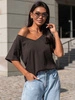 Bawełniany T-SHIRT bluzka z krótkim rękawem z dekoltem V brązowa X404