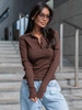 Basic Bawełniana BLUZKA z prążkowanej dzianiny z kołnierzykiem brązowa X405