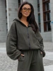 Oversizowa BLUZA z kapturem zapinana na zamek bluzowana kangurka z bawełnianej dresówki dark khaki X1