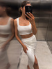 ( ilość produktów: 229 )KOMPLET dopasowany top krótki na ramkach i maxi asymetryczna spódnica przekładana ecru E303