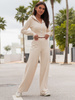 Bawełniany KOMPLET z prążkowanej dzianiny krótka bluzka i dopasowane spodnie z szerokimi nogawkami beżowy D406 k01