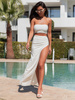 Elegancki KOMPLET dopasowany krótki asymetryczny top na ramkach ze złotymi koralikami i maxi spódnica z rozporkiem ecru E326 k01