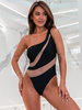 STRÓJ KĄPIELOWY jednoczęściowy na jedno ramię asymetryczny z tiulem czarny + siatka beżowa S134 k01