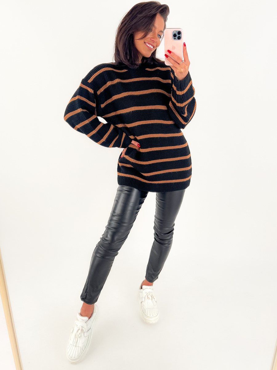 Dłuższy sweter tunika w nieregularne pasy czarny 13398