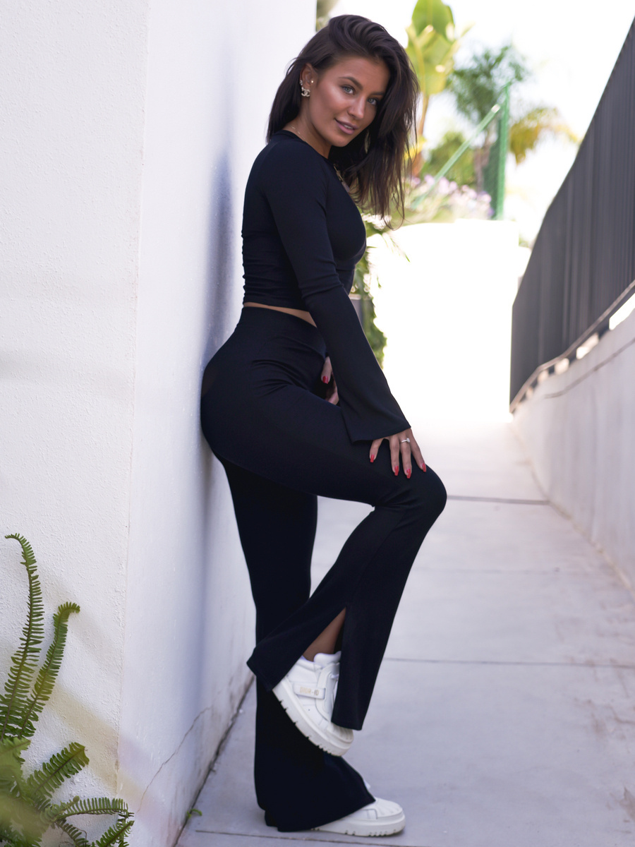 Komplet : krótka bluzka z długim rękawem rozszerzanym z rozcięciem na dole, dopasowane spodnie z wysokim stanem z rozszerzanymi nogawkami . Uszyty z lejącej dzianiny , miękkiej i elastycznej . Idealny na codzienne wyjścia jak również na specjalne okazje.