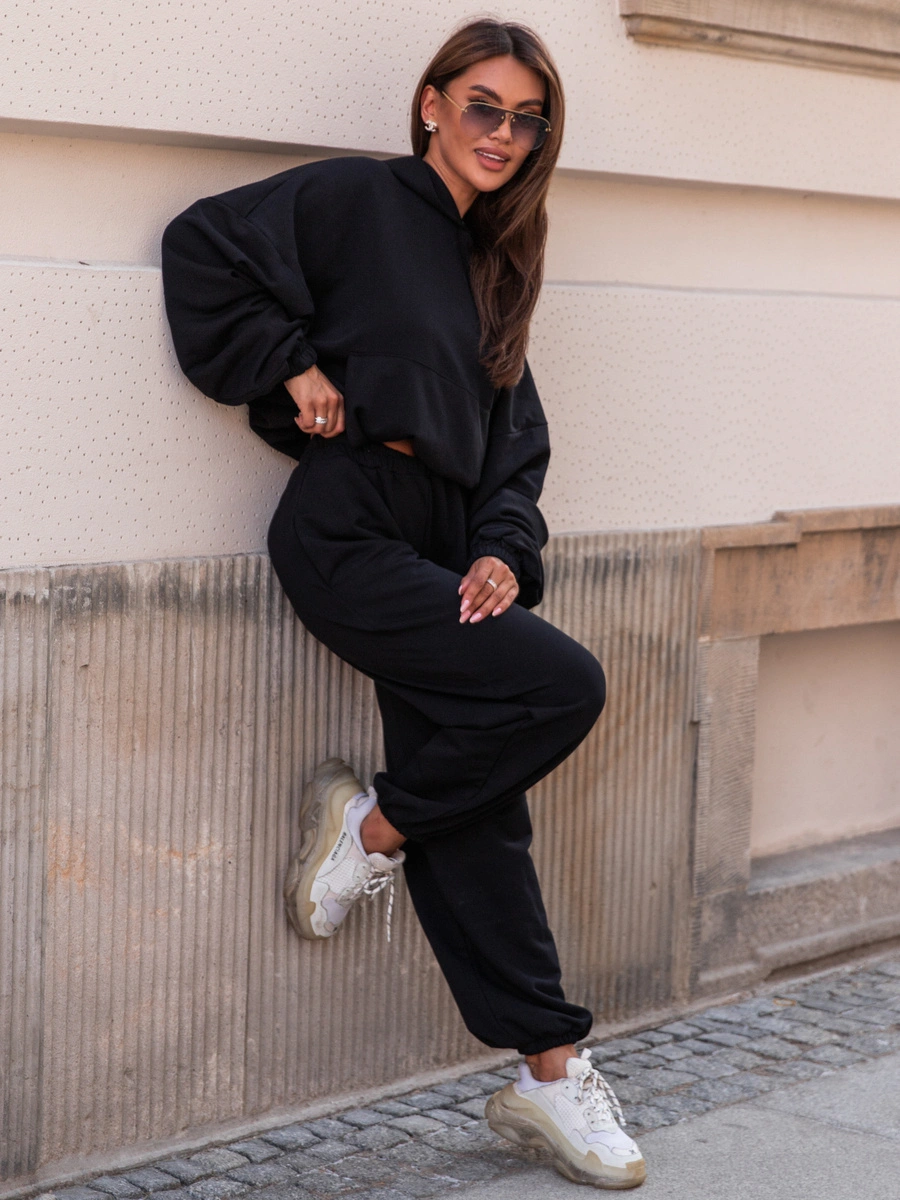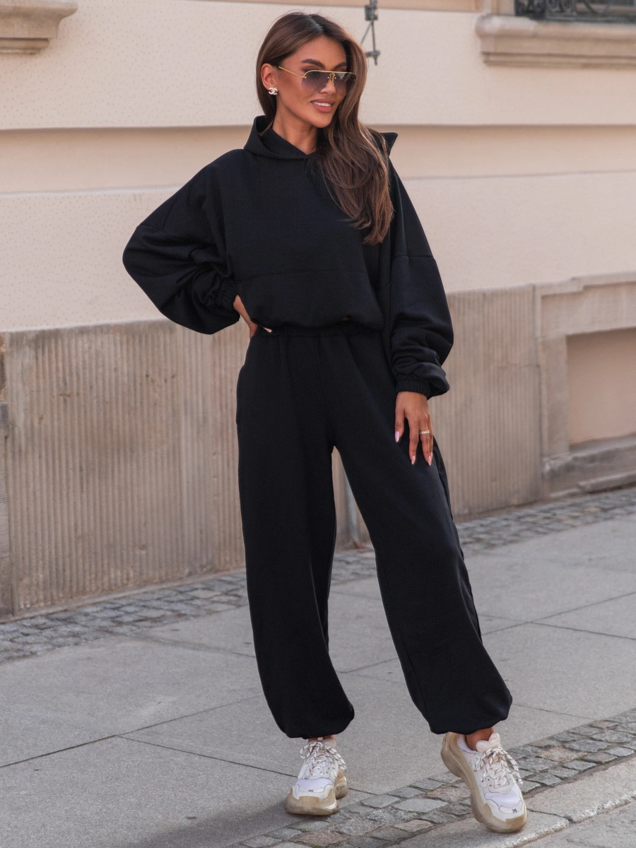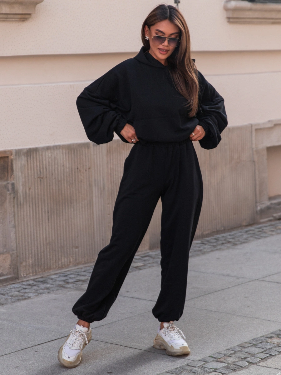 Dresowy bawełniany KOMPLET oversizowy bluza z kapturem i szerokie spodnie ze ściągaczami czarny E315