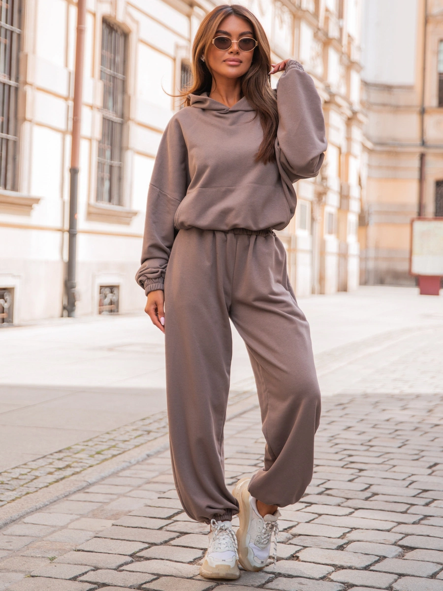 Dresowy bawełniany KOMPLET oversizowy bluza z kapturem i szerokie spodnie ze ściągaczami coffee E315