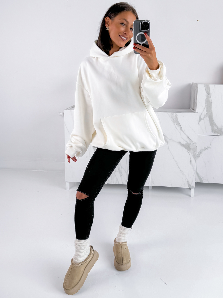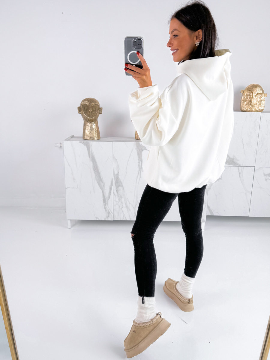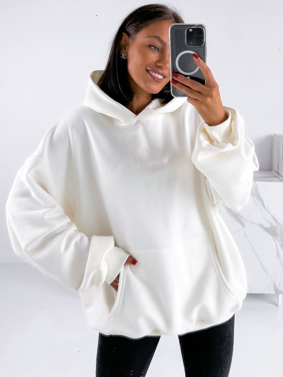 Bawełniana dresowa BLUZA oversize z kapturem i mankietami z prążkowanej dzianiny ecru E340 k01