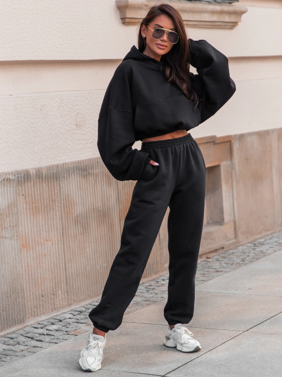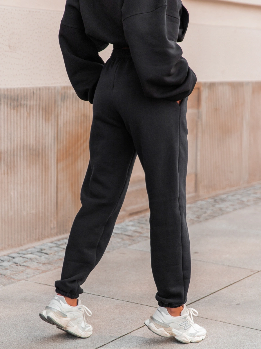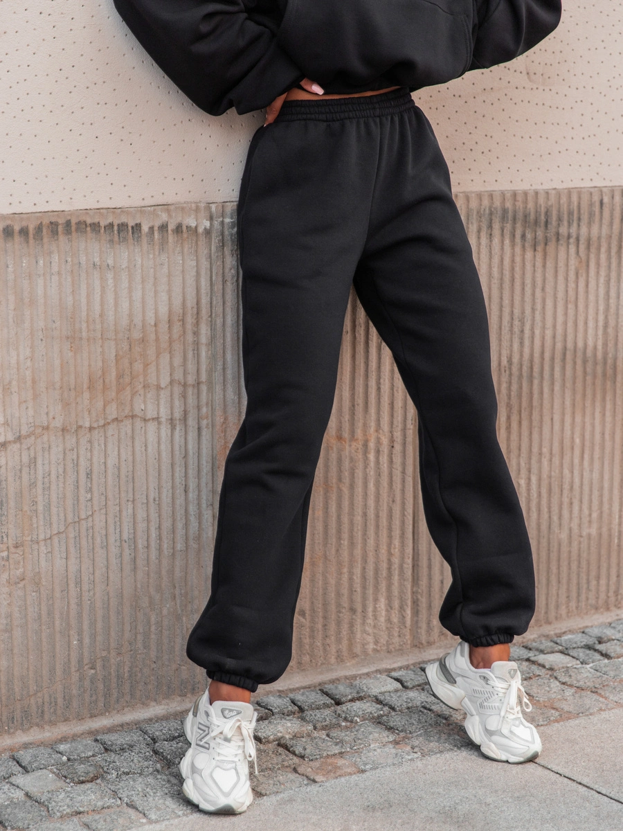 Dresowe bawełniane SPODNIE z wysokim stanem luźny krój ze ściągaczami czarne E341