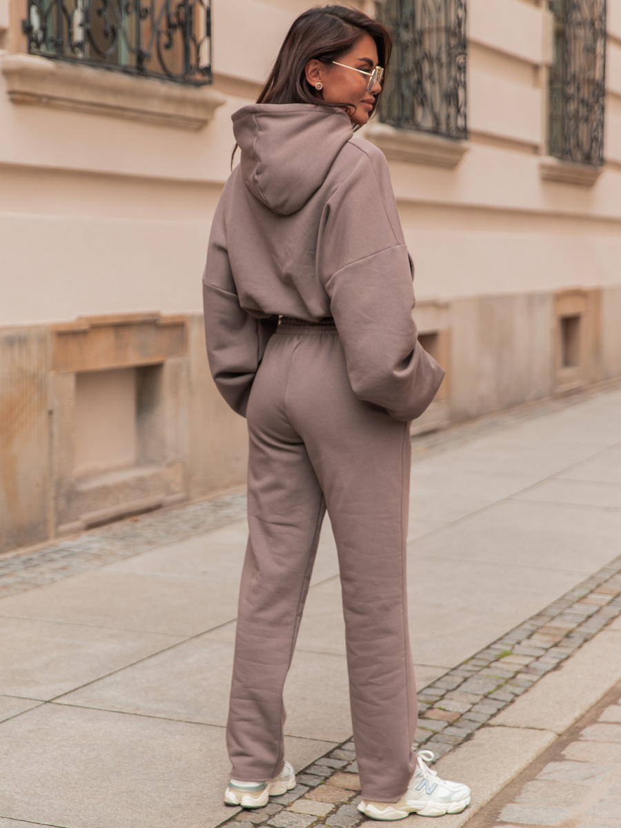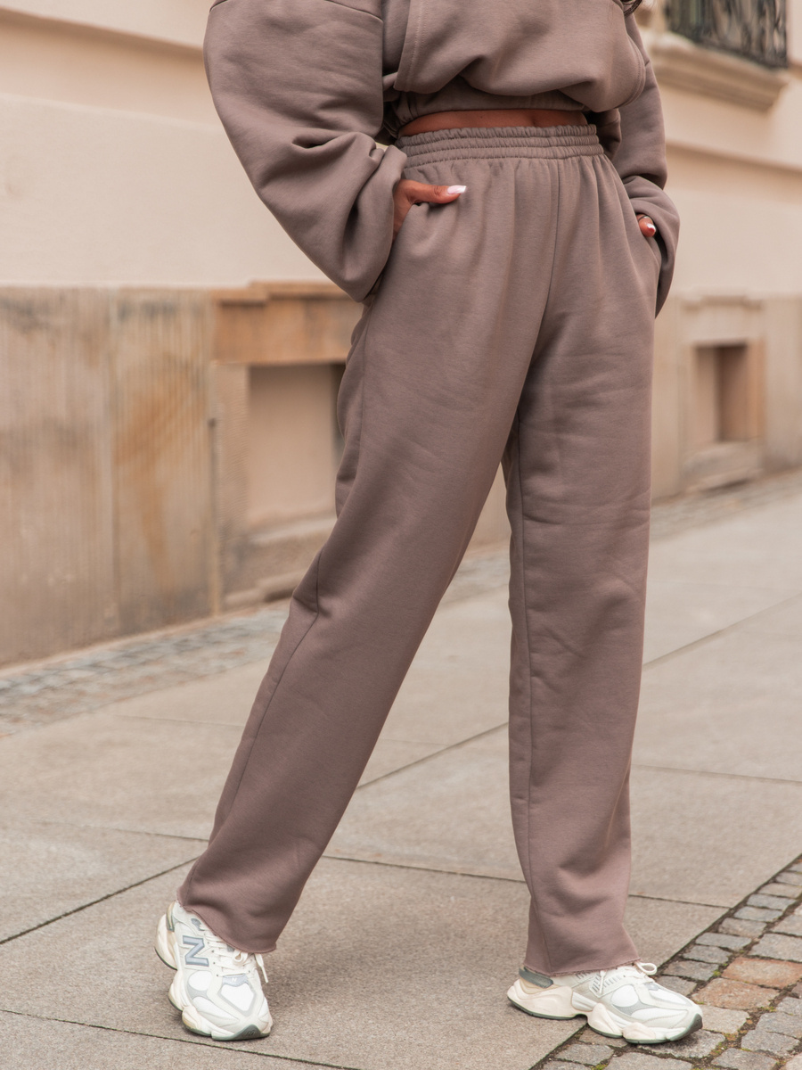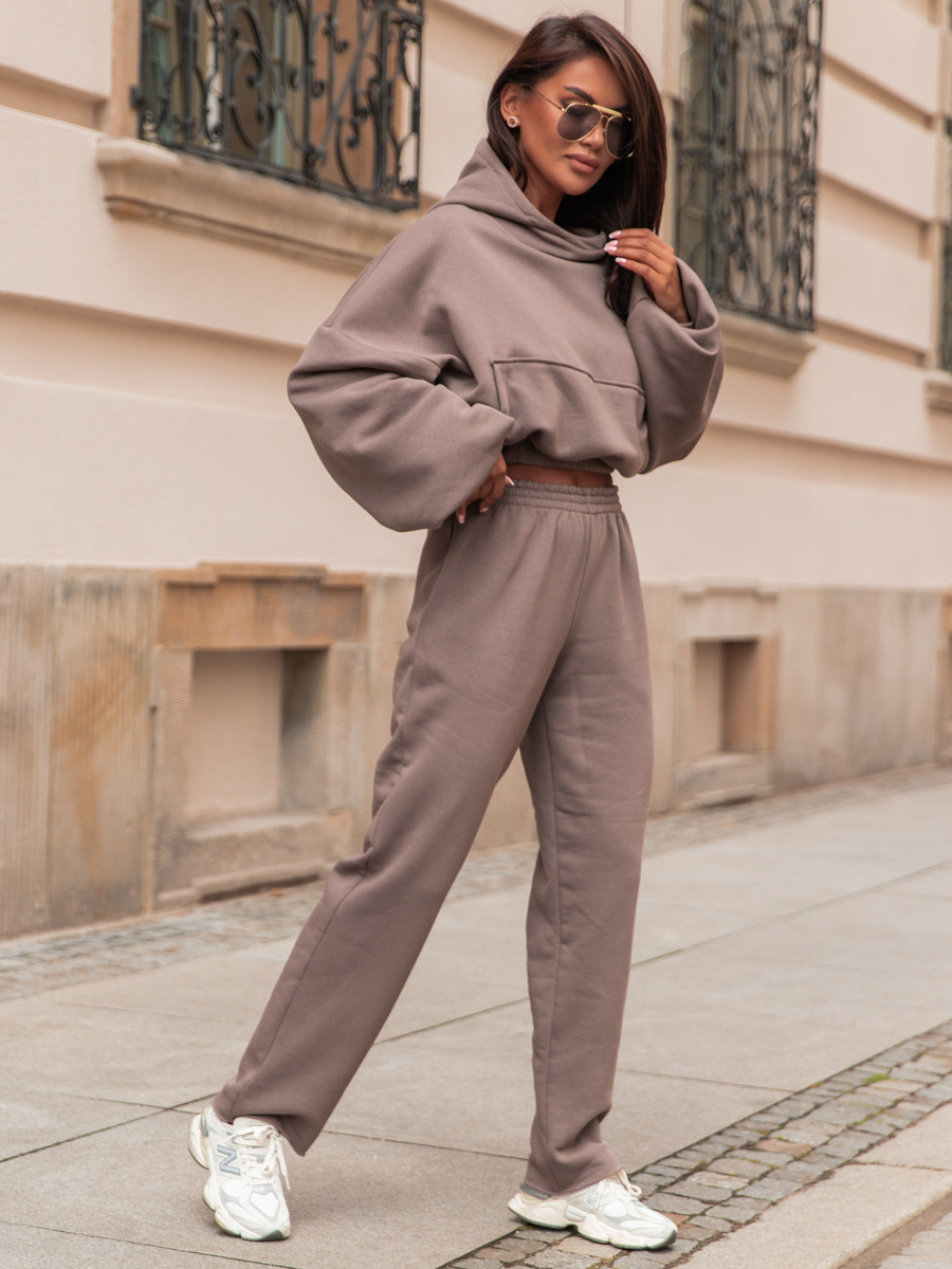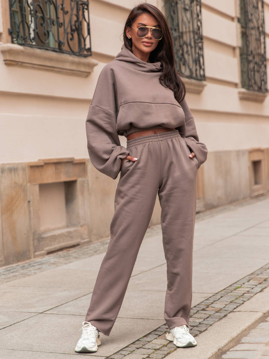 Dresowe bawełniane SPODNIE z wysokim stanem luźny krój coffee E359 k01
