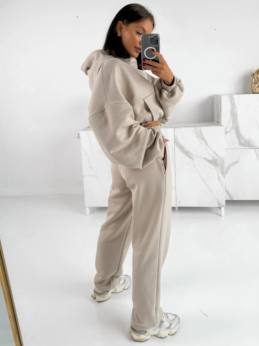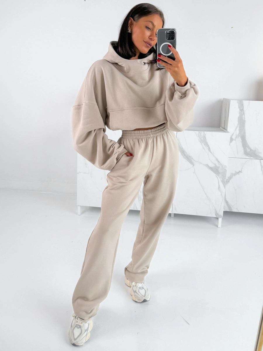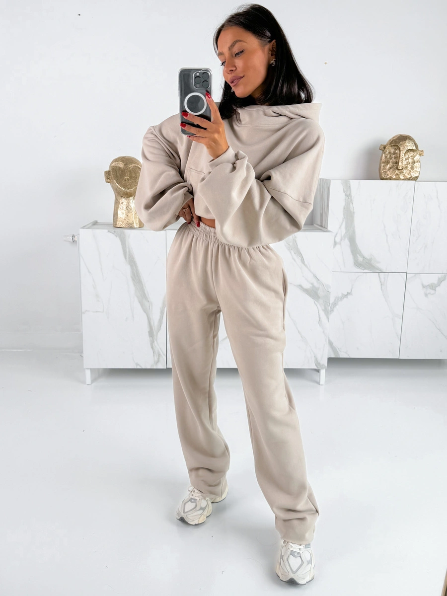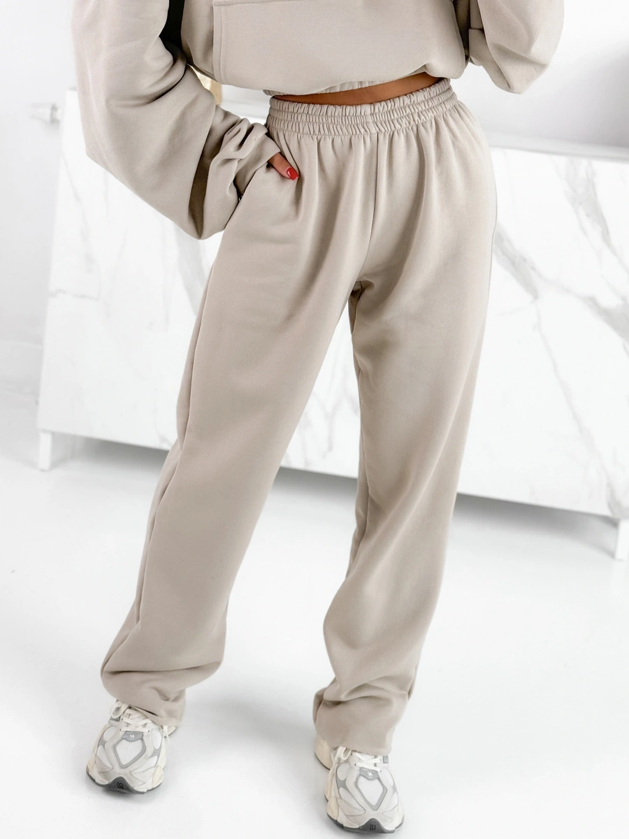 Dresowe bawełniane SPODNIE z wysokim stanem luźny krój stone E359 k01