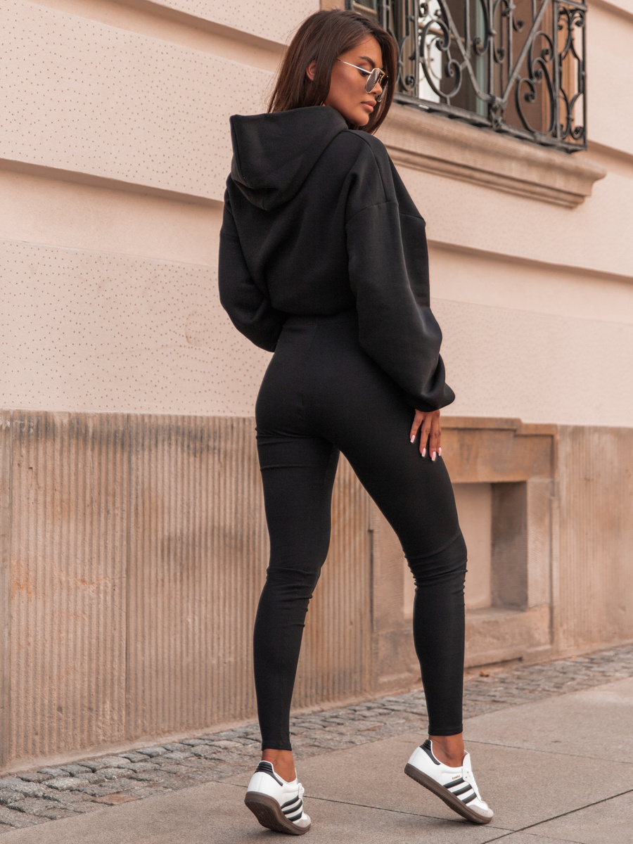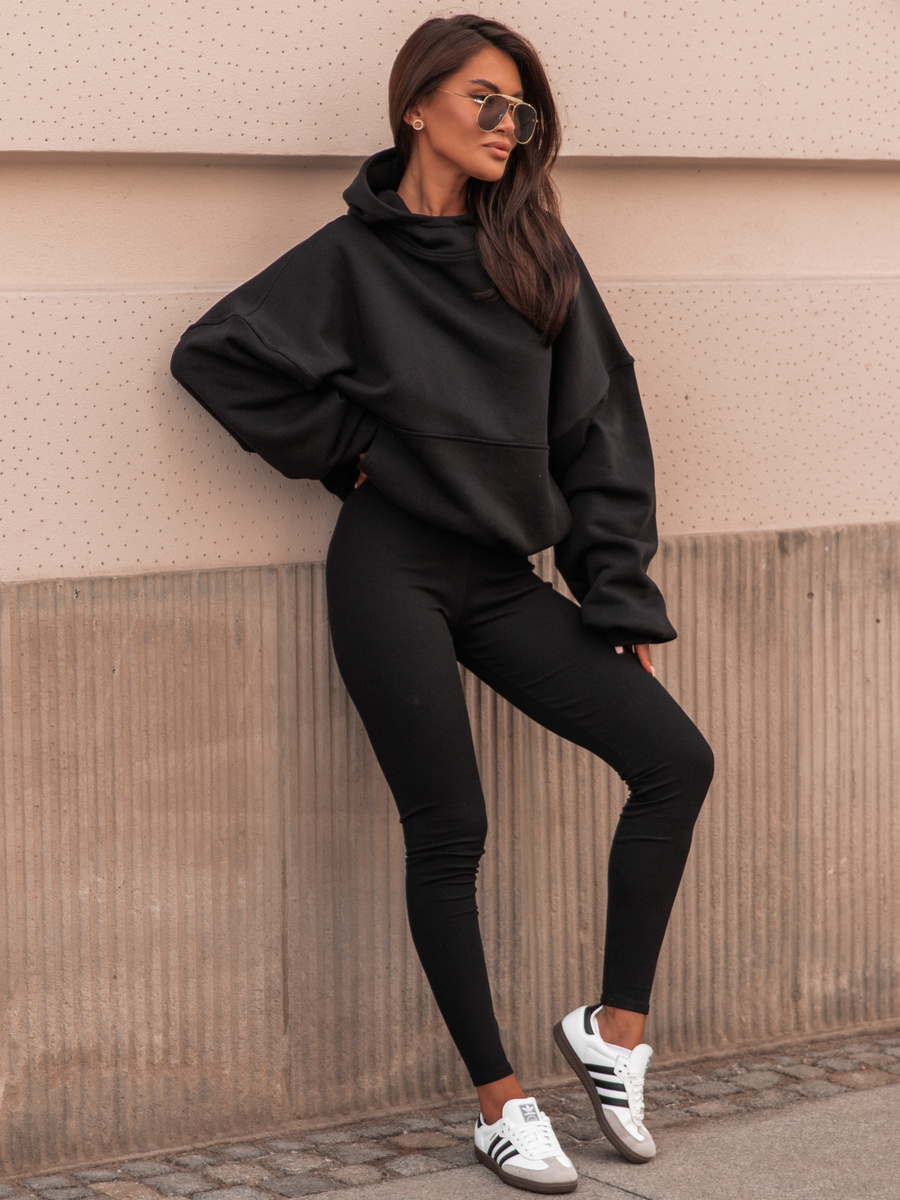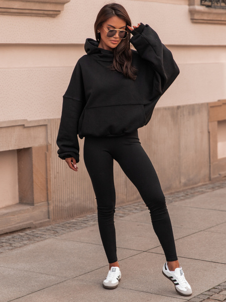 Komplet: luźna oversizowa bluza dresowa kangurka z kapturem z długim rękawem i spodnie dopasowane legginsy z wysokim stanem. Bluza uszyta z wysokiej jakości dresu bawełnianego drapanego od wewnątrz a legginsy z bawełnianej dzianiny o fakturze prążka. Materiał wysokiej jakości od polskiego producenta.