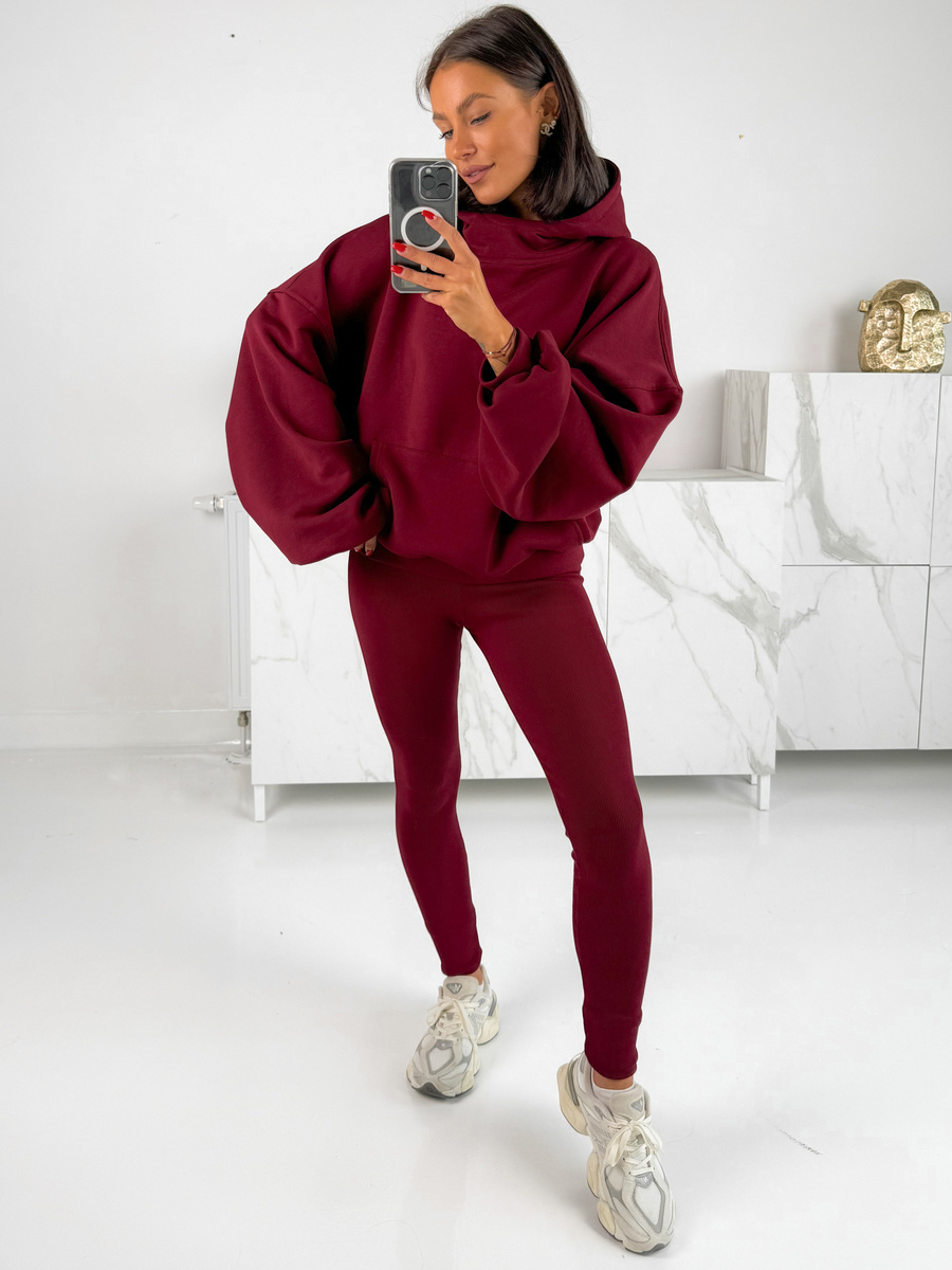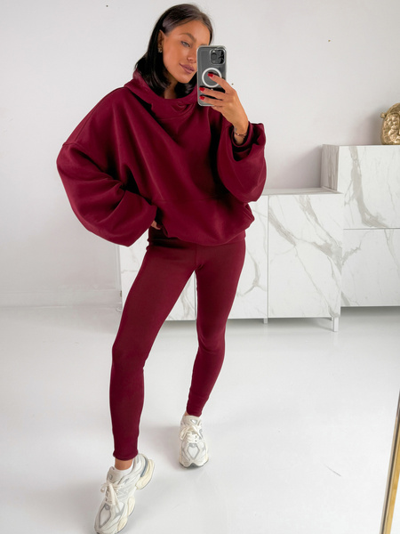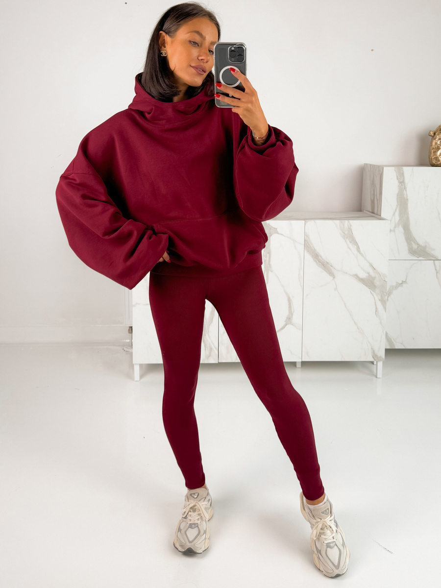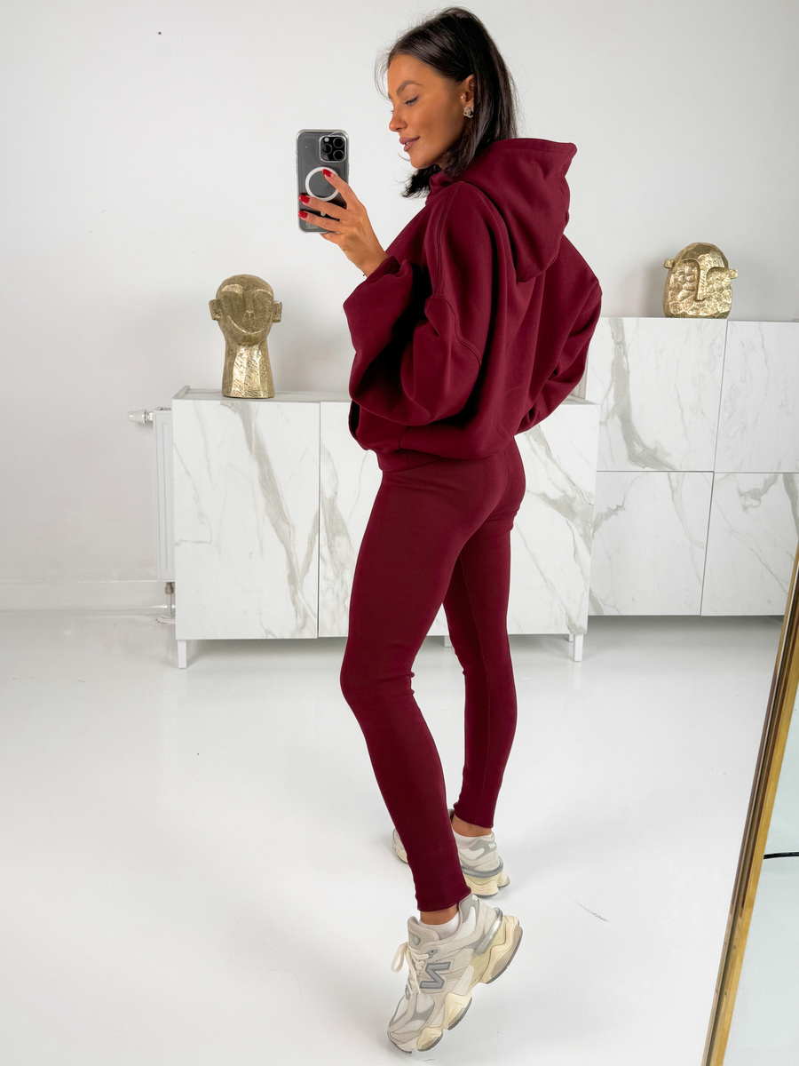 Bawełniany KOMPLET dresowa bluza kangurka z kapturem i spodnie legginsy z prążkowanej dzianiny bordowy E368 k01