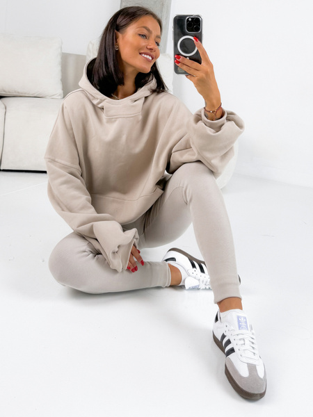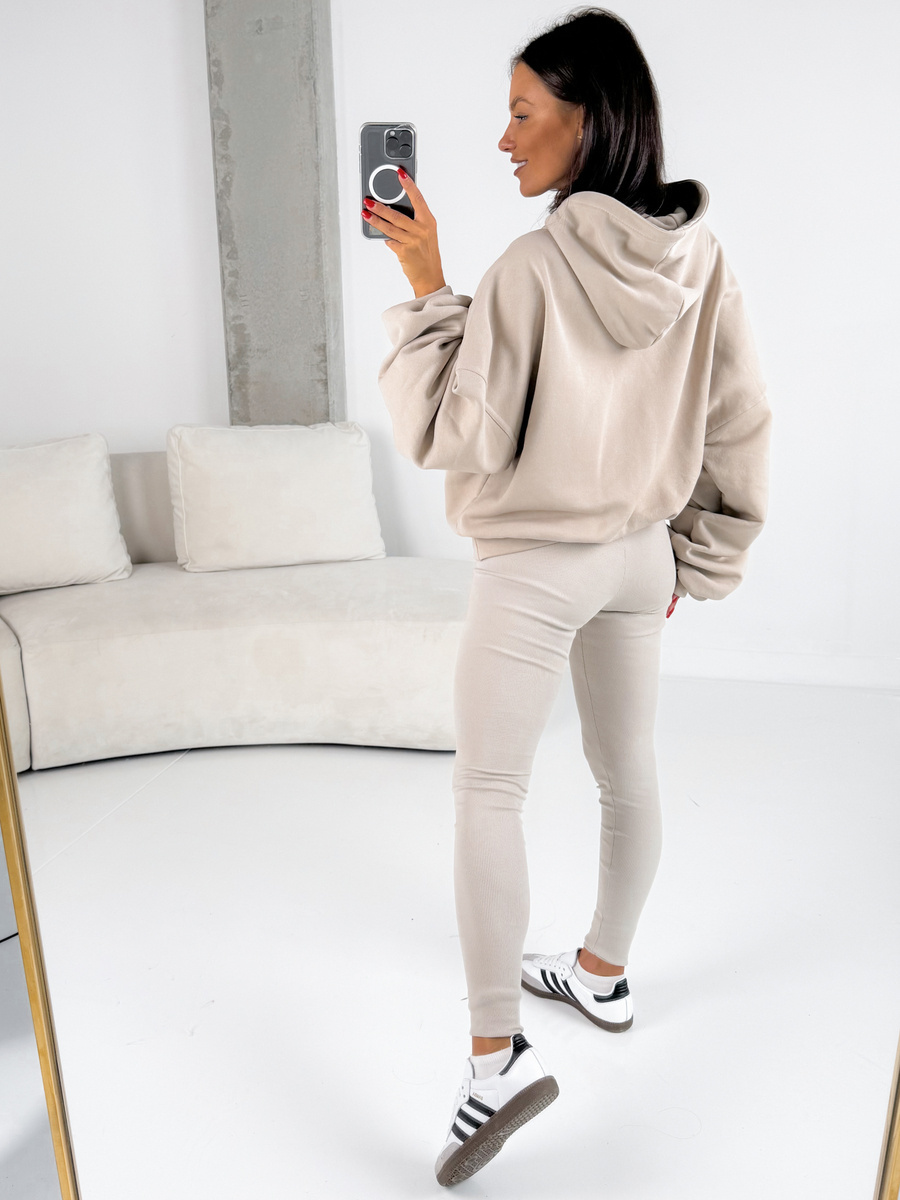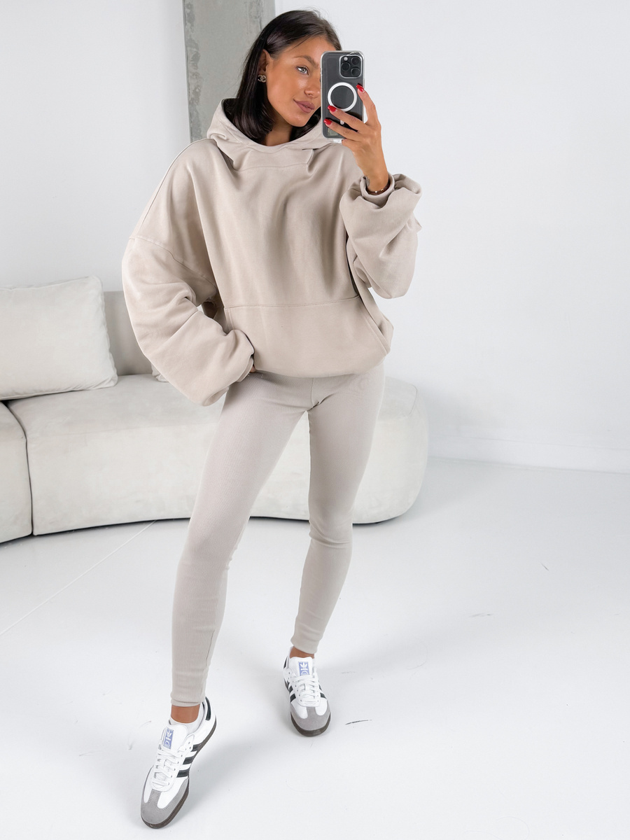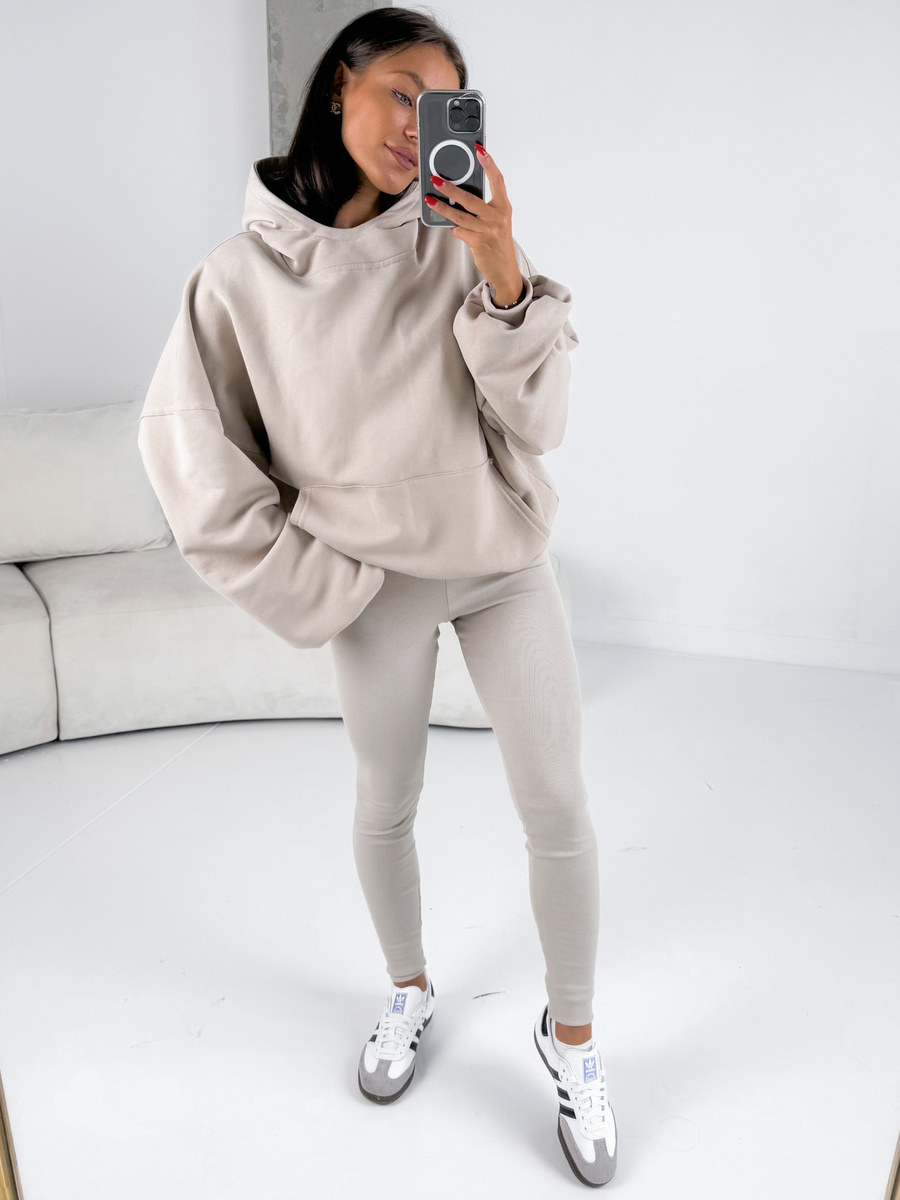 Komplet: luźna oversizowa bluza dresowa kangurka z kapturem z długim rękawem i spodnie dopasowane legginsy z wysokim stanem. Bluza uszyta z wysokiej jakości dresu bawełnianego drapanego od wewnątrz a legginsy z bawełnianej dzianiny o fakturze prążka. Materiał wysokiej jakości od polskiego producenta.