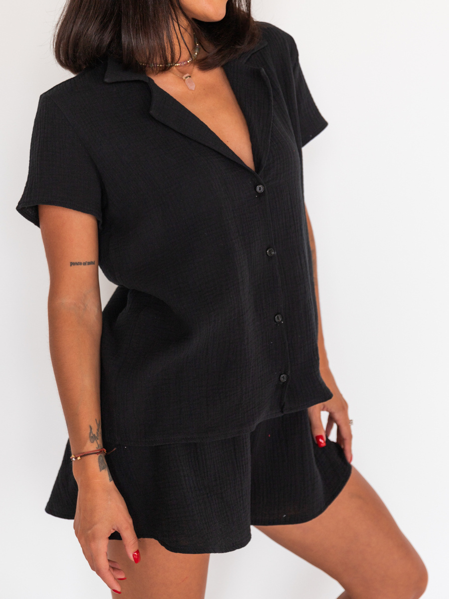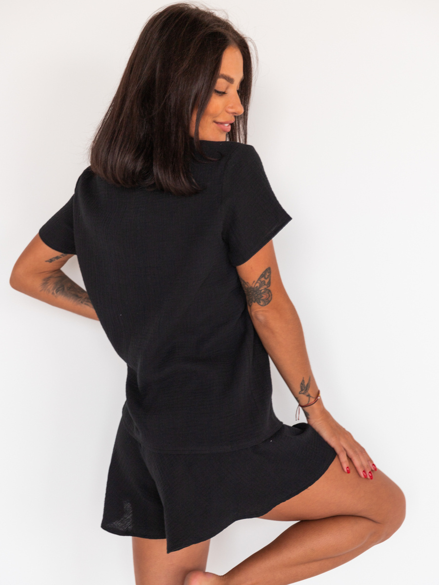 Bawełniana muślinowa PIŻAMA komplet bluzka o kroju koszulowym i spodenki czarna P42 k01