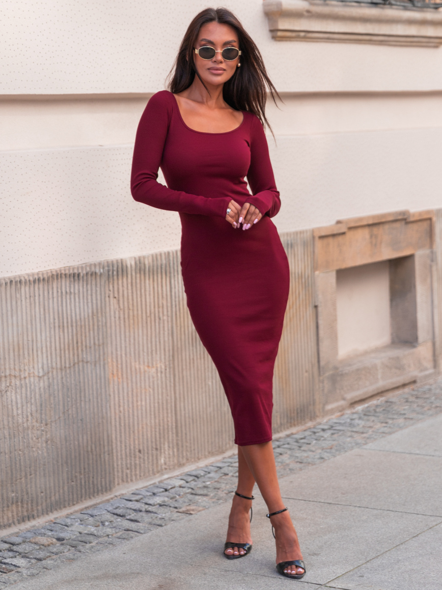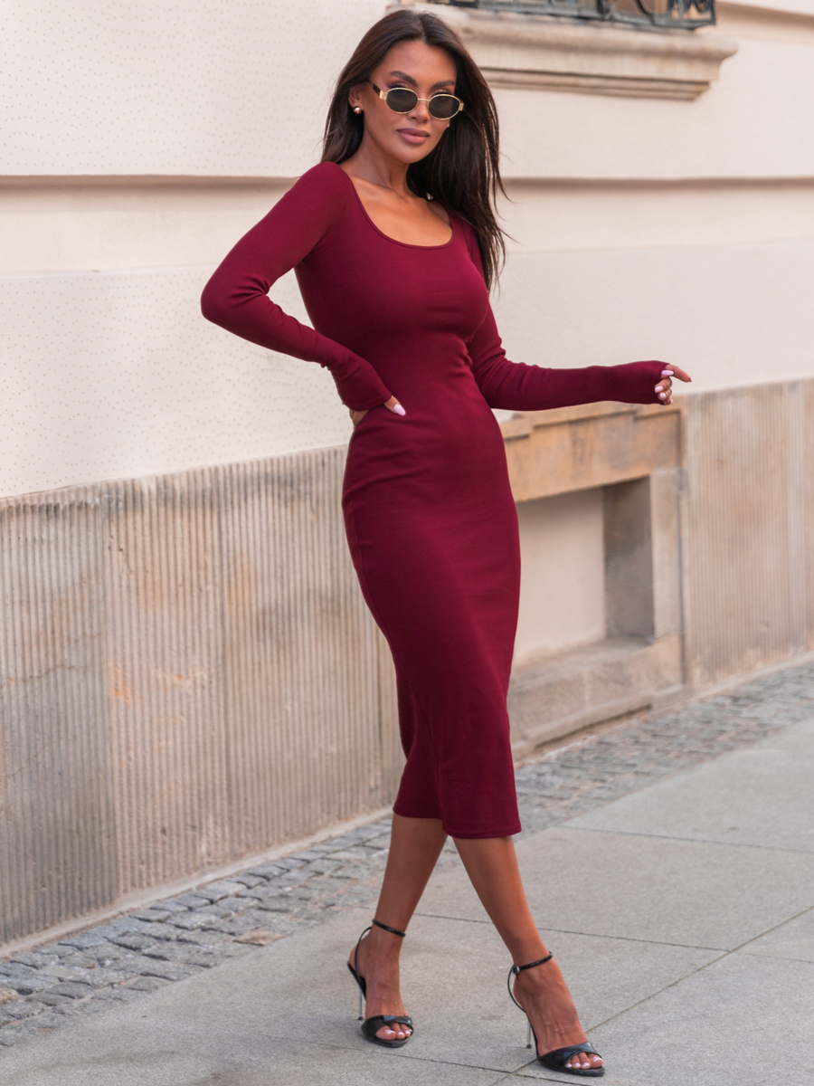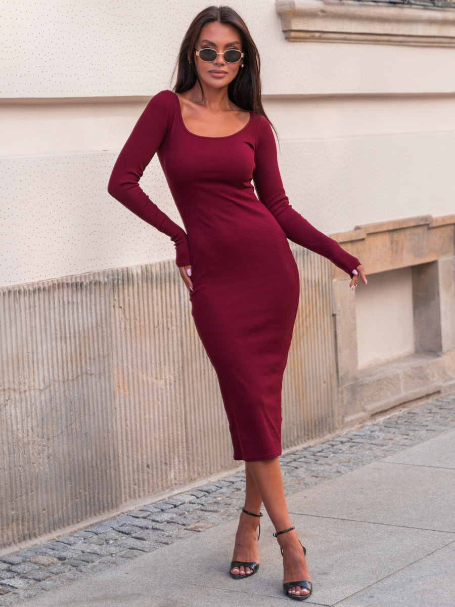 Opinie o Dopasowana bawełniana SUKIENKA maxi z dekoltem z prążkowanej dzianiny bordowy E410 k01