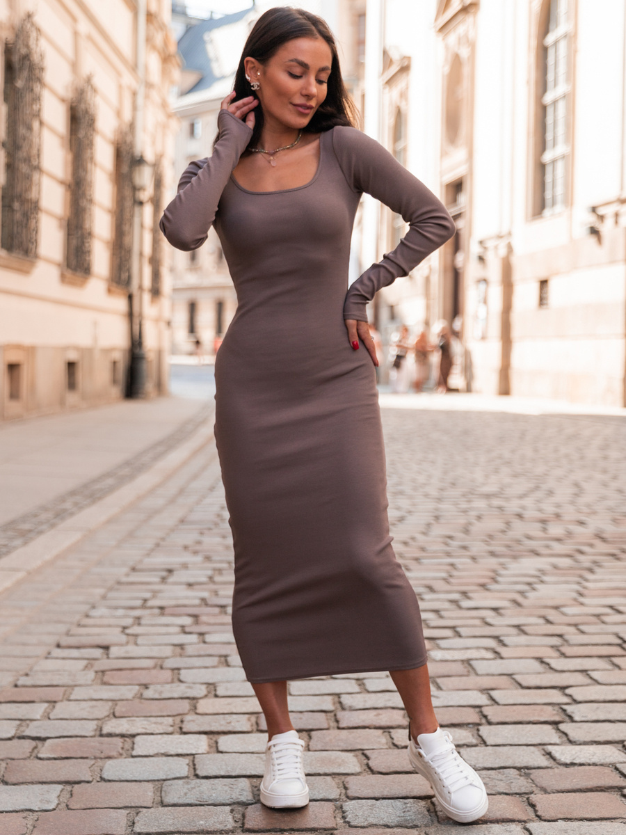 Dopasowana bawełniana SUKIENKA maxi z dekoltem z prążkowanej dzianiny coffee E410 k01