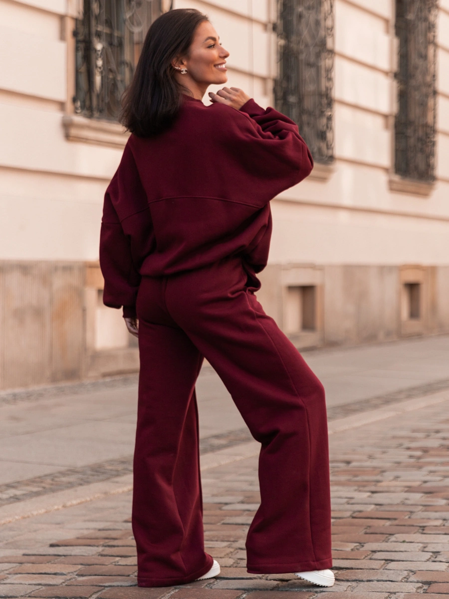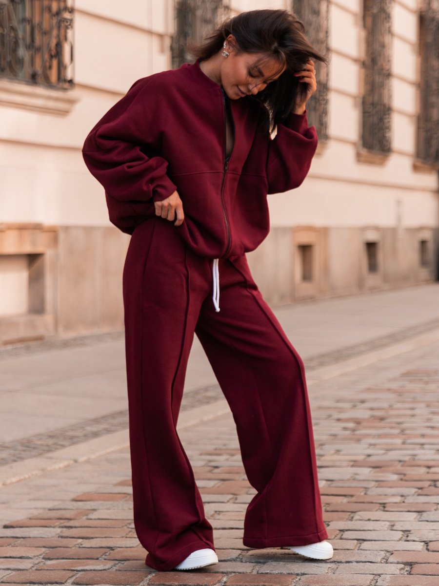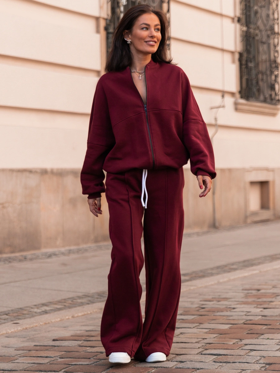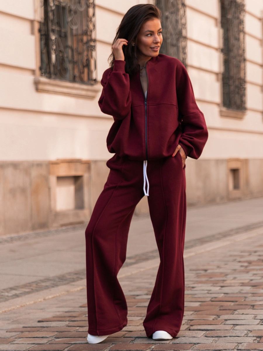 Komplet dresowy : bluza na zamek bez kaptura , na stójce , mankiety z prążkowanej dzianiny bawełnianej i spodnie z wysokim stanem z szerokimi nogawkami. Luźny krój. Uszyty z dresowej dzianiny bawełnianej drapanej od wewnątrz dzięki czemu jest przyjemna w noszeniu , materiał najwyższej jakości od polskiego producenta.
