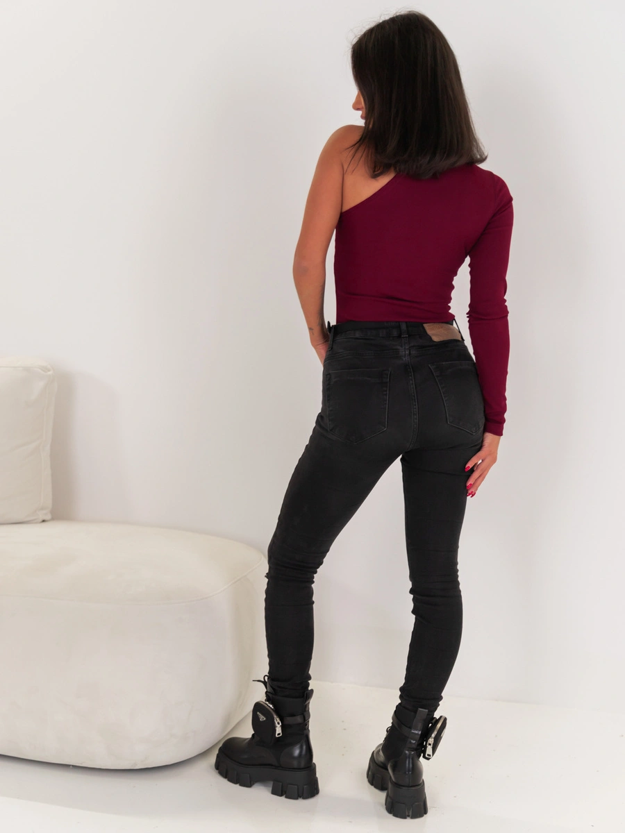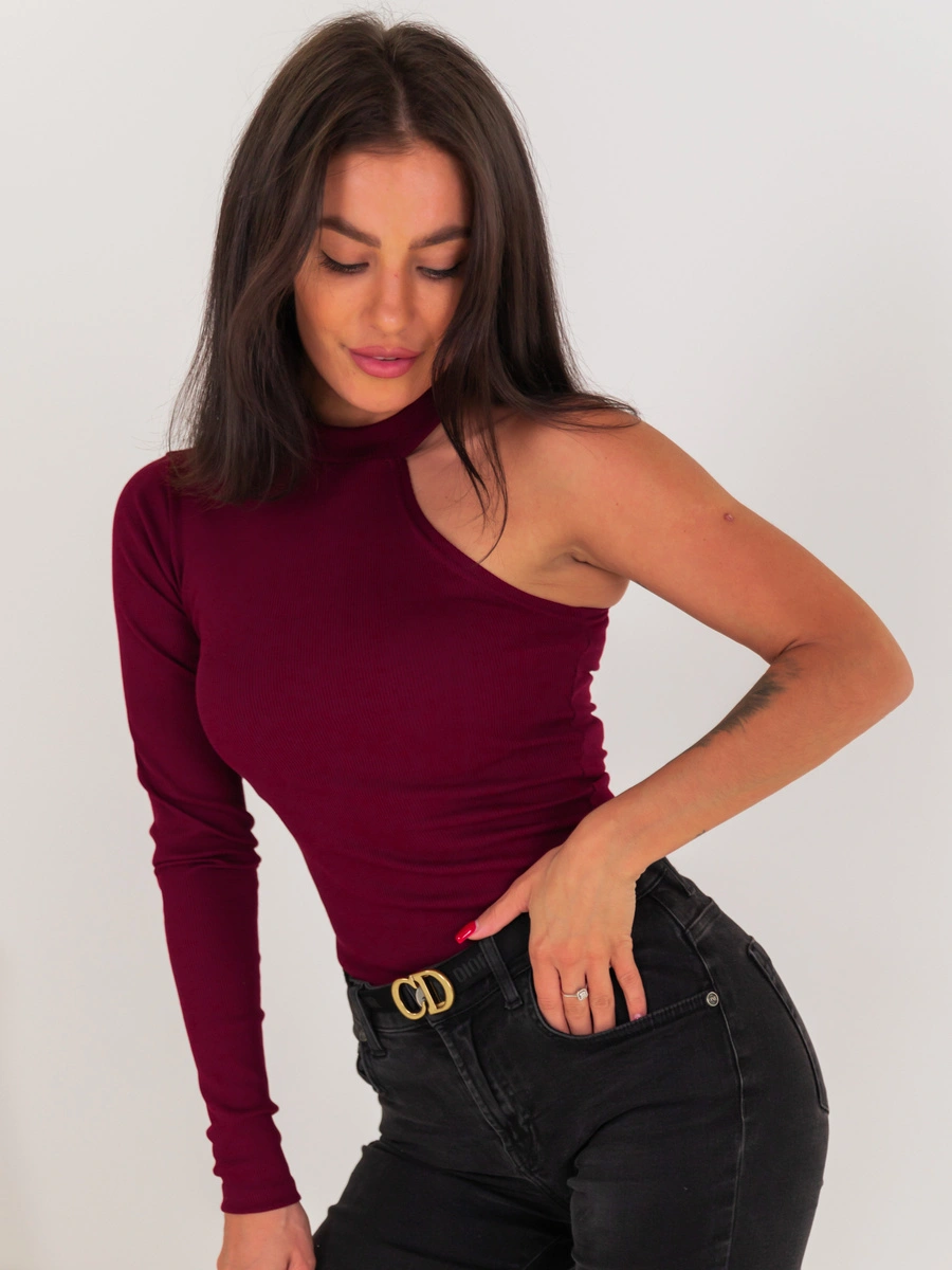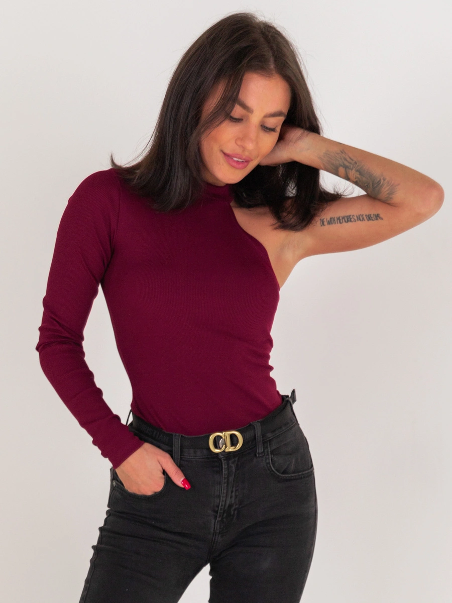 Bawełniana BLUZKA z prążkowanej dzianiny z jednym asymetrycznym długim rękawem i chokerem bordowa E512 k01
