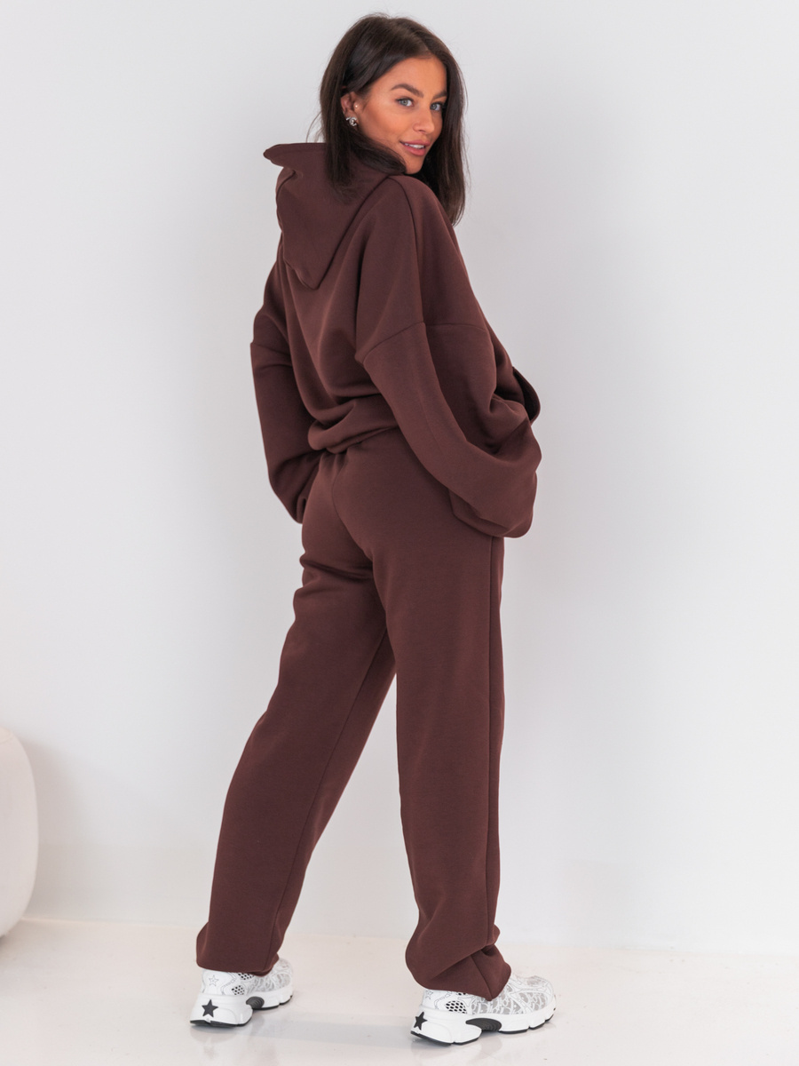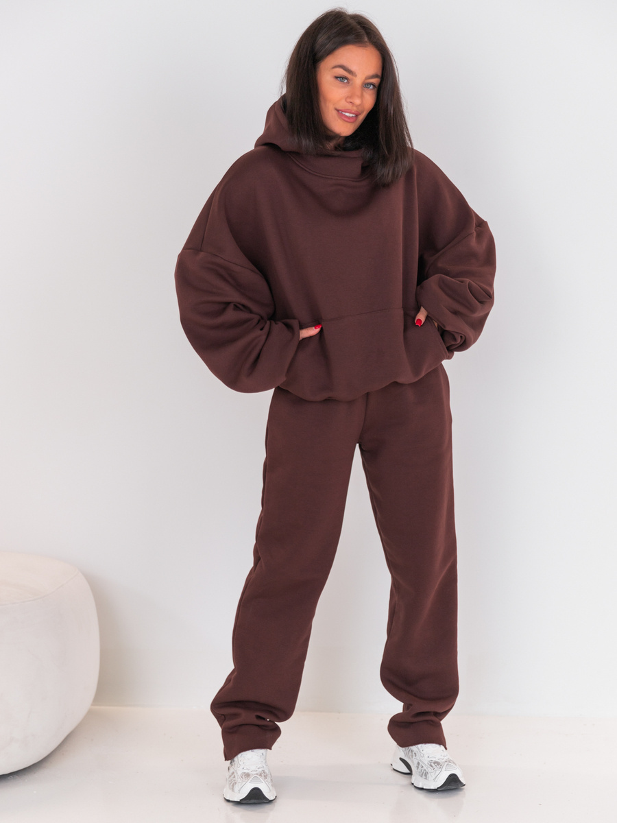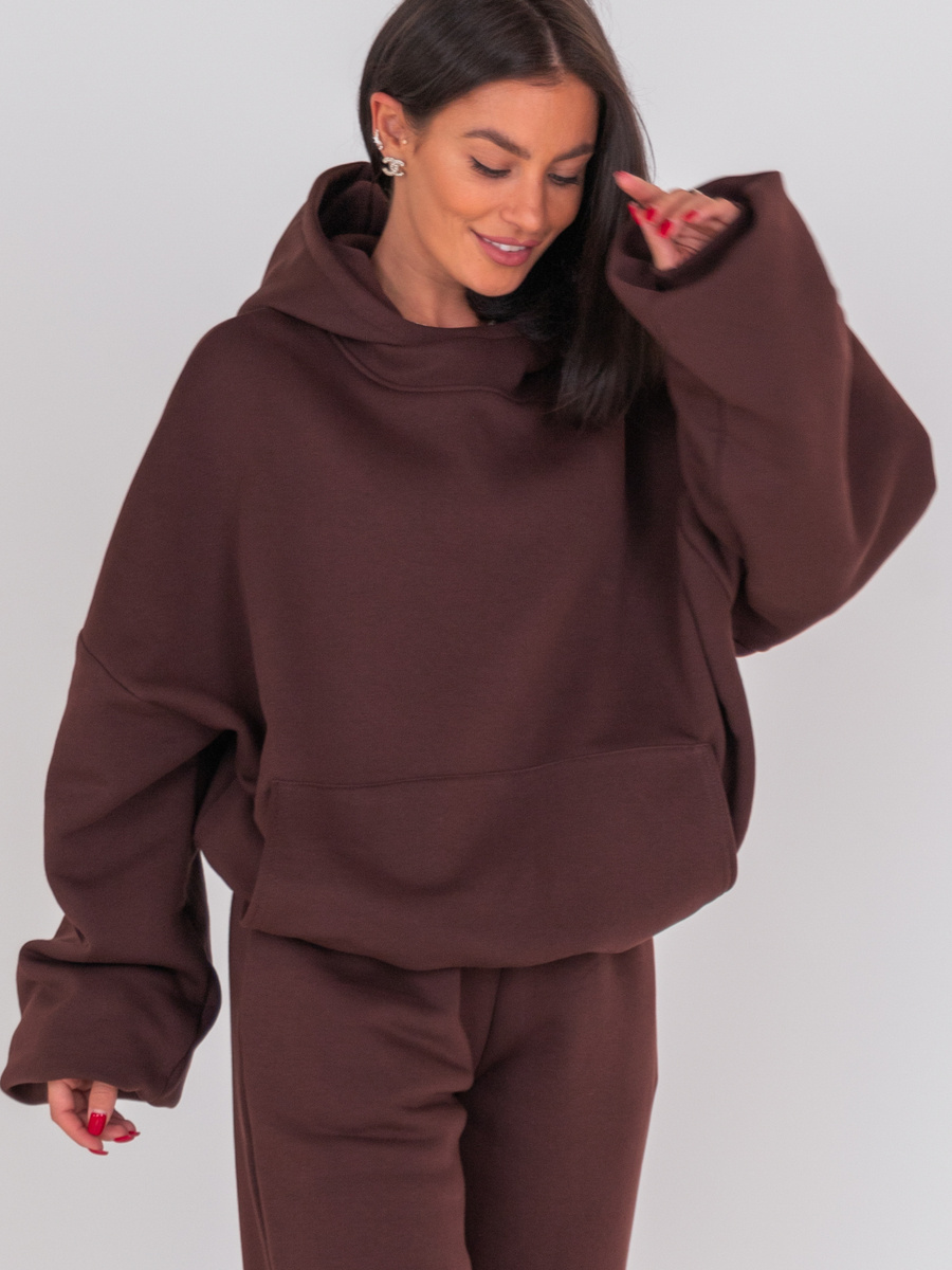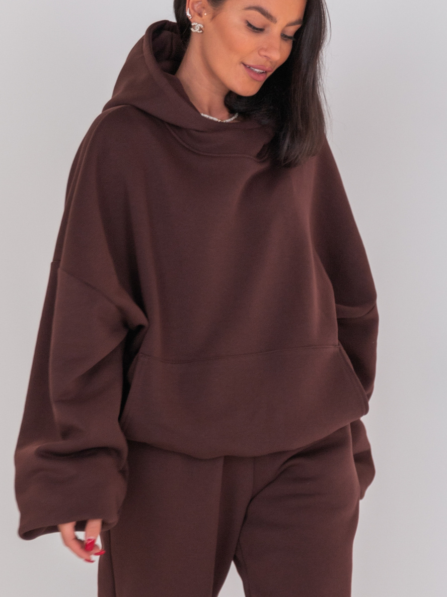 Opinie o Bawełniana BLUZA z drapanego dresu z kapturem na stójce z kieszeniami kangurka brązowa E1