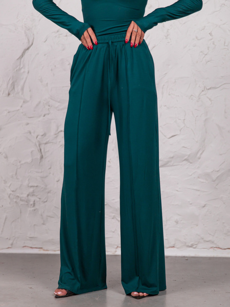 Luźne spodnie z wysokim stanem, z gumką w pasie. Przeszycie wzdłuż nogawek i szeroki wygodny krój. Uszyte z dzianiny wiskozowej od polskiego producenta. W naszej ofercie znajdziesz również różne bluzki z tego samego materiału, stwórz swój idealny komplet.