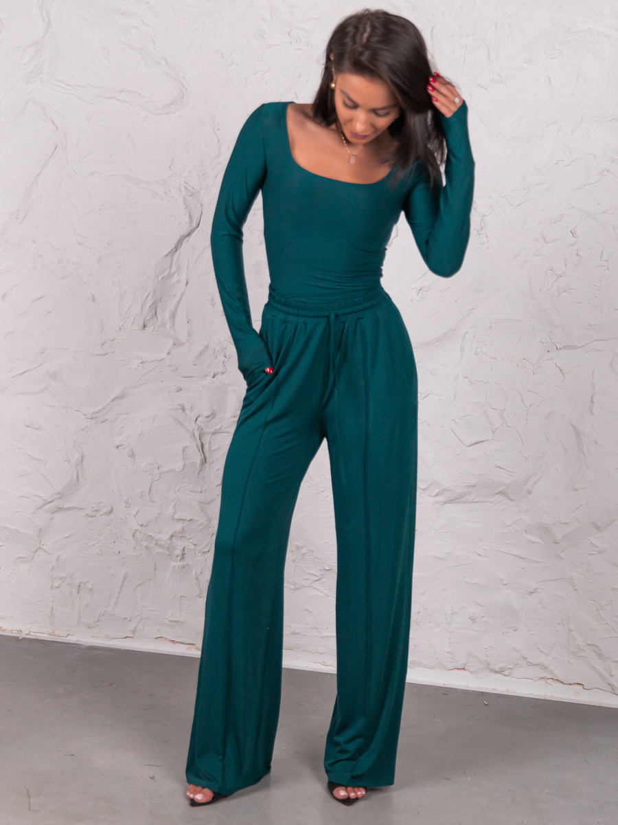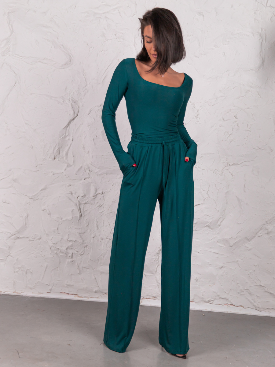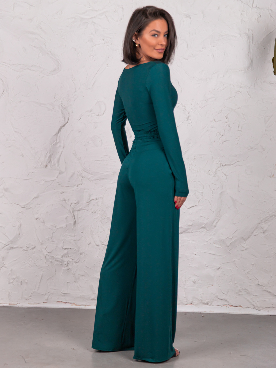 Opinie o KOMPLET bluzka z kwadratowym dekoltem i szerokie spodnie z wiskozy zielony E650 K01