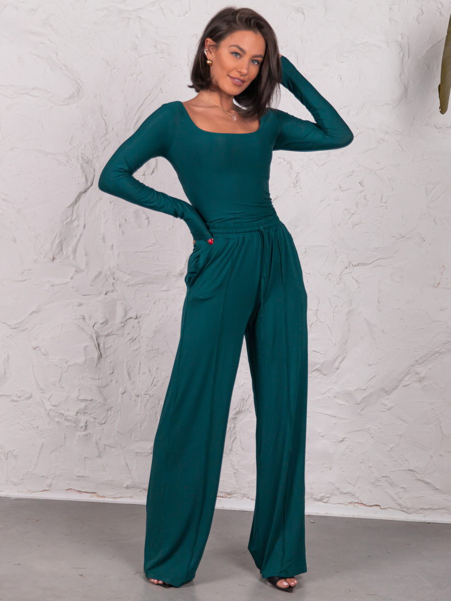 KOMPLET bluzka z kwadratowym dekoltem i szerokie spodnie z wiskozy zielony E650 K01