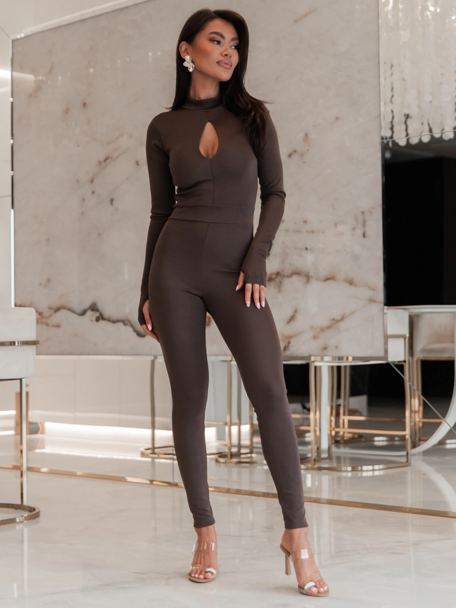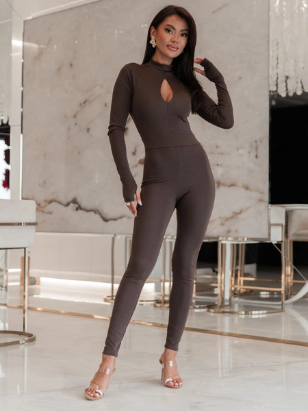 Elegancki dopasowany kombinezon, z półgolfem, z wycięciem na biuście typu łezka. Zapinany z tyłu na kryty zamek. Uszyty z eleganckiej dzianiny poliestrowej od polskiego producenta.