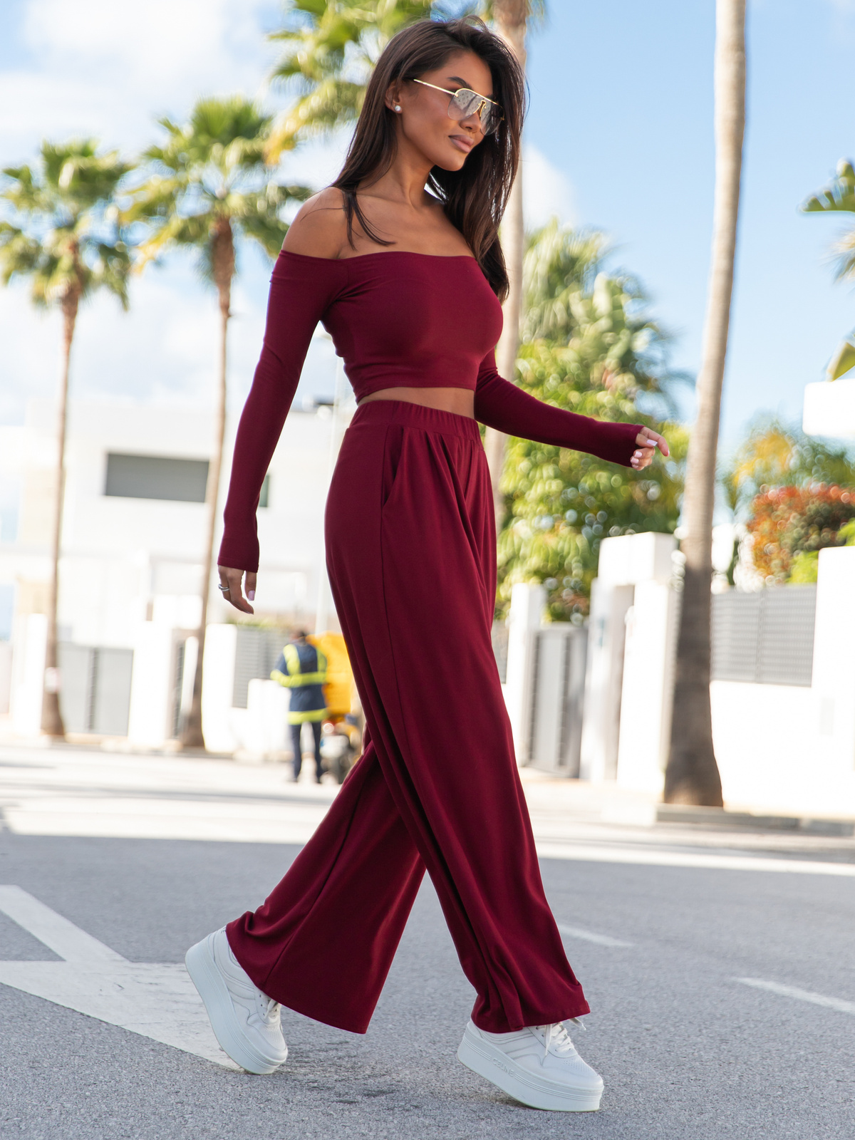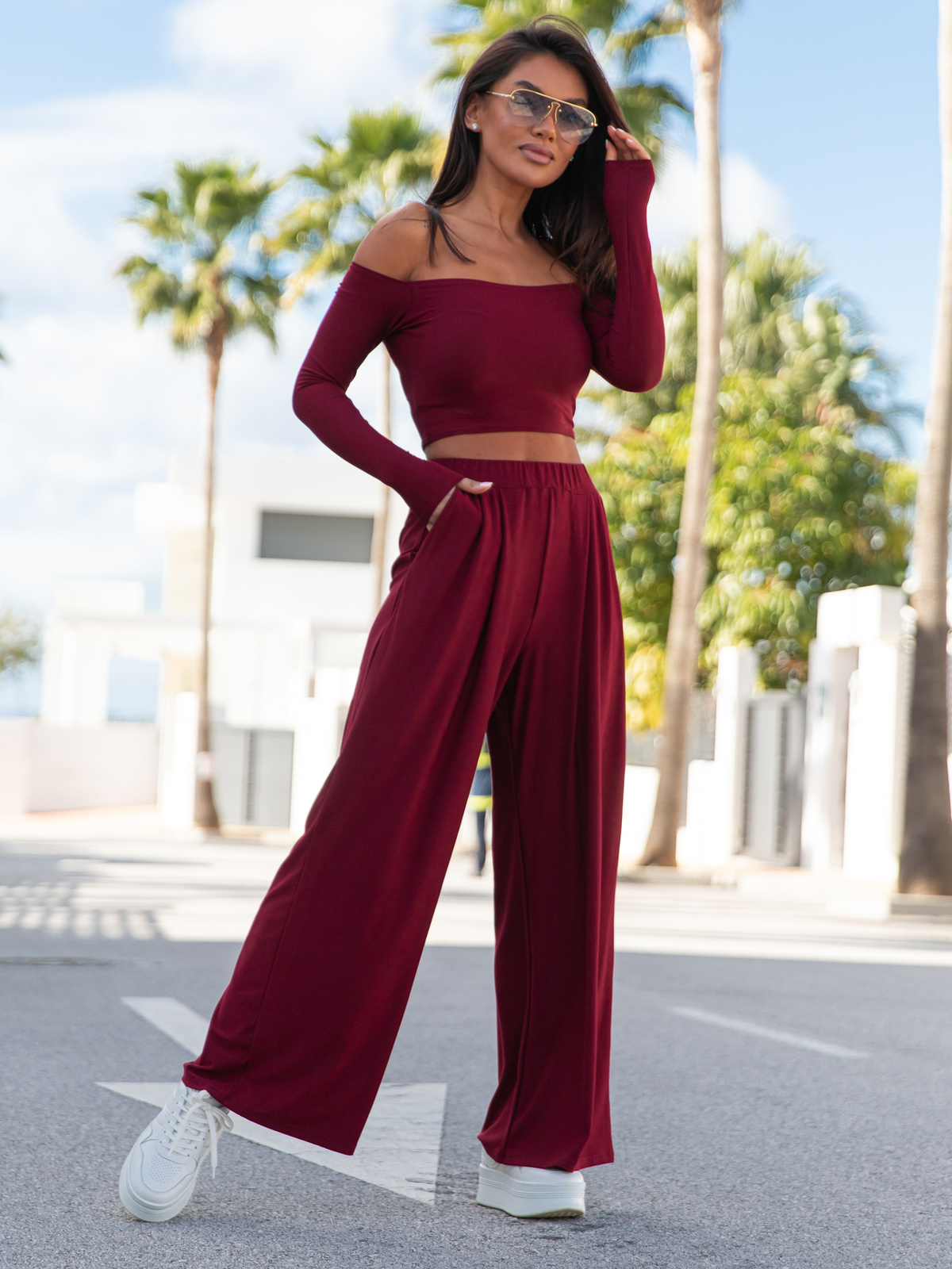Szerokie SPODNIE z wiskozy z wysokim stanem z zaszewkami bordowe X18 k01