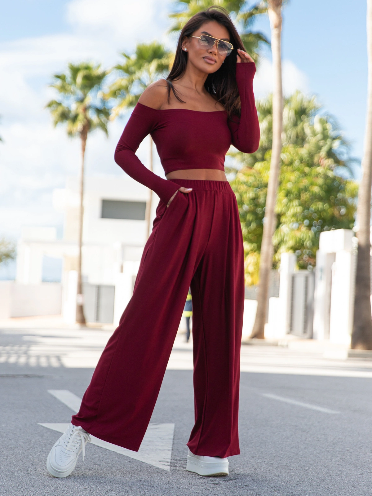 Dopasowana BLUZKA krótki top z wiskozy opuszczana na ramiona bordowa X19 k01