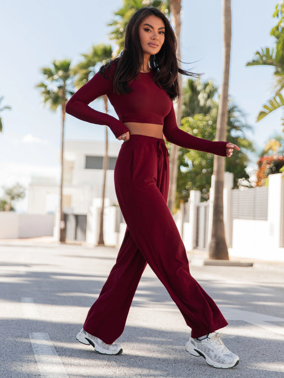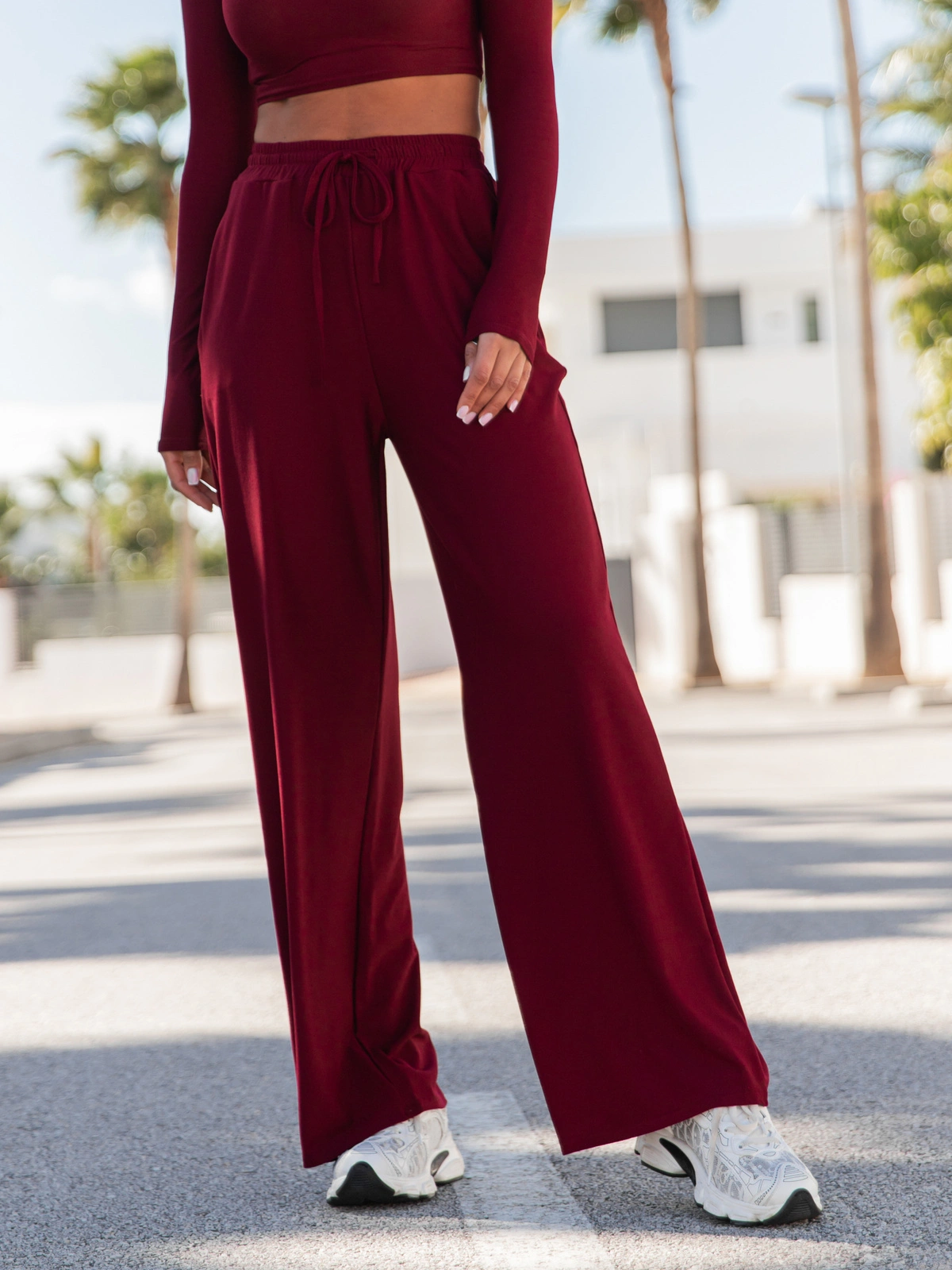 Szerokie SPODNIE z wiskozy z wysokim stanem z gumką w pasie bordowe X20 k01
