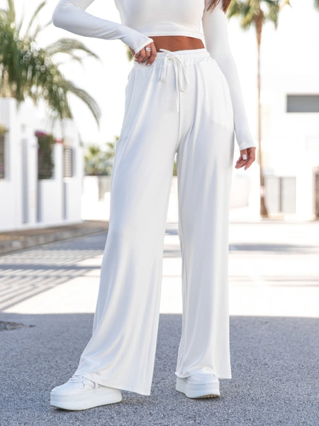 Szerokie SPODNIE z wiskozy z wysokim stanem z gumką w pasie ecru X20 k01