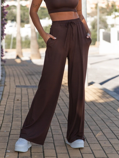 Szerokie SPODNIE z wiskozy z wysokim stanem z gumką w pasie brązowe X20 k01