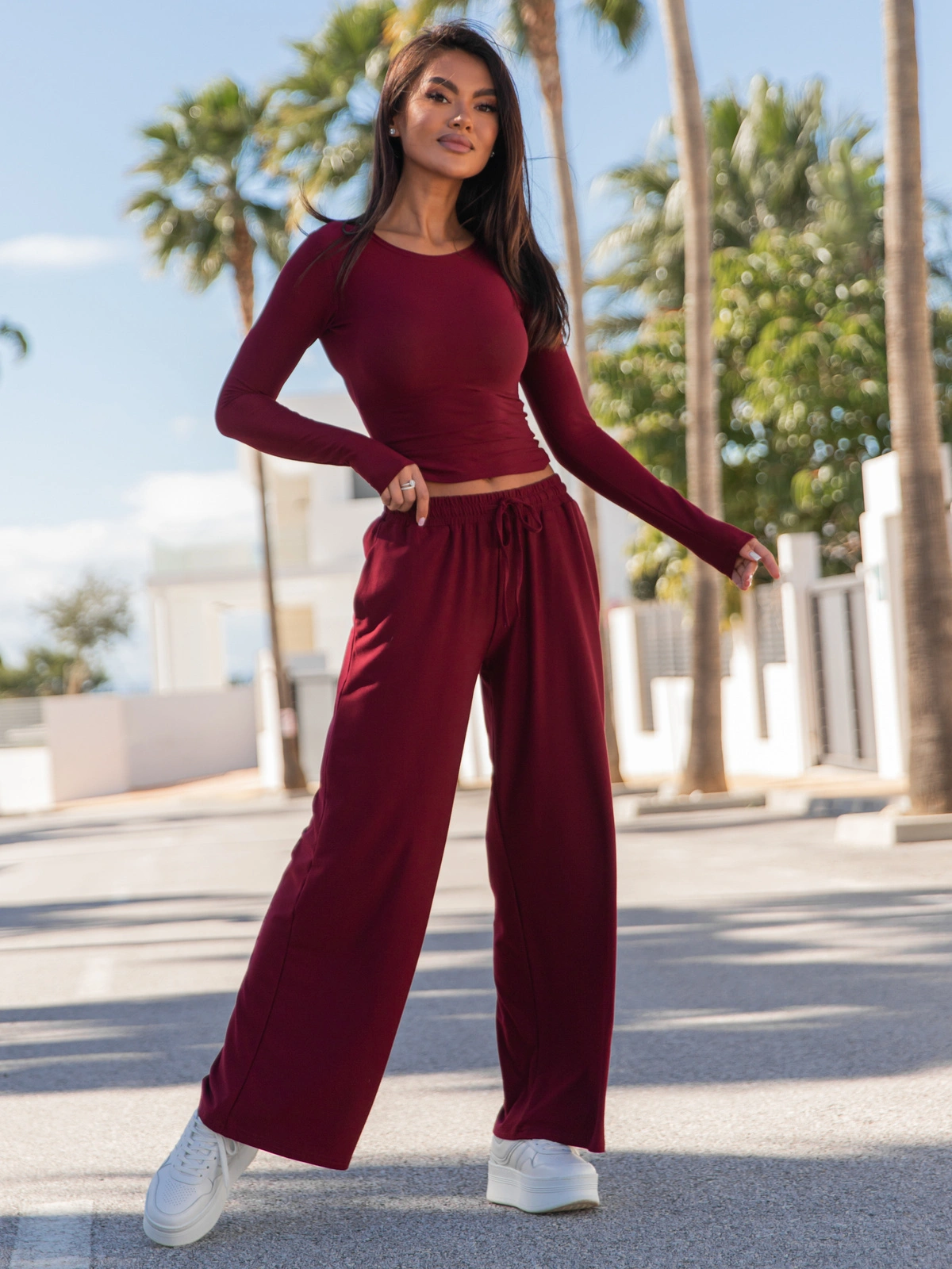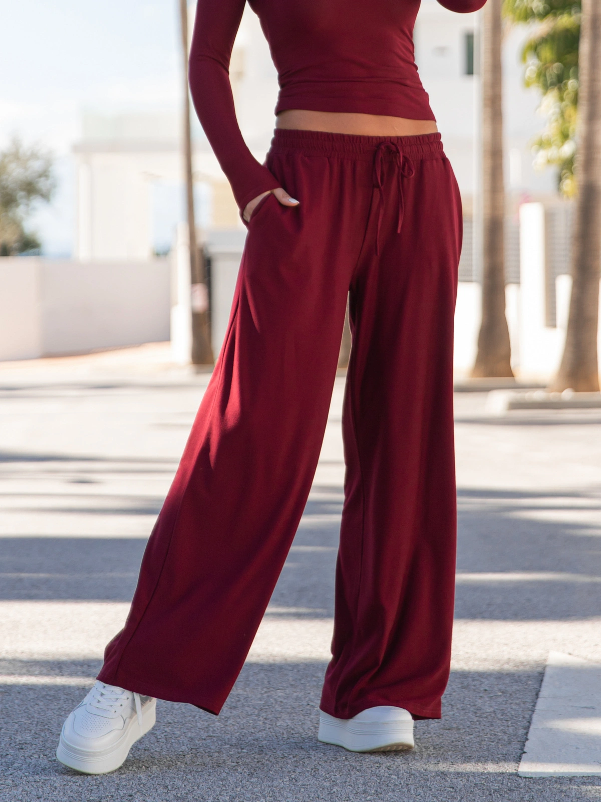Szerokie SPODNIE z wiskozy z niskim stanem z gumką w pasie bordowe X24 k01