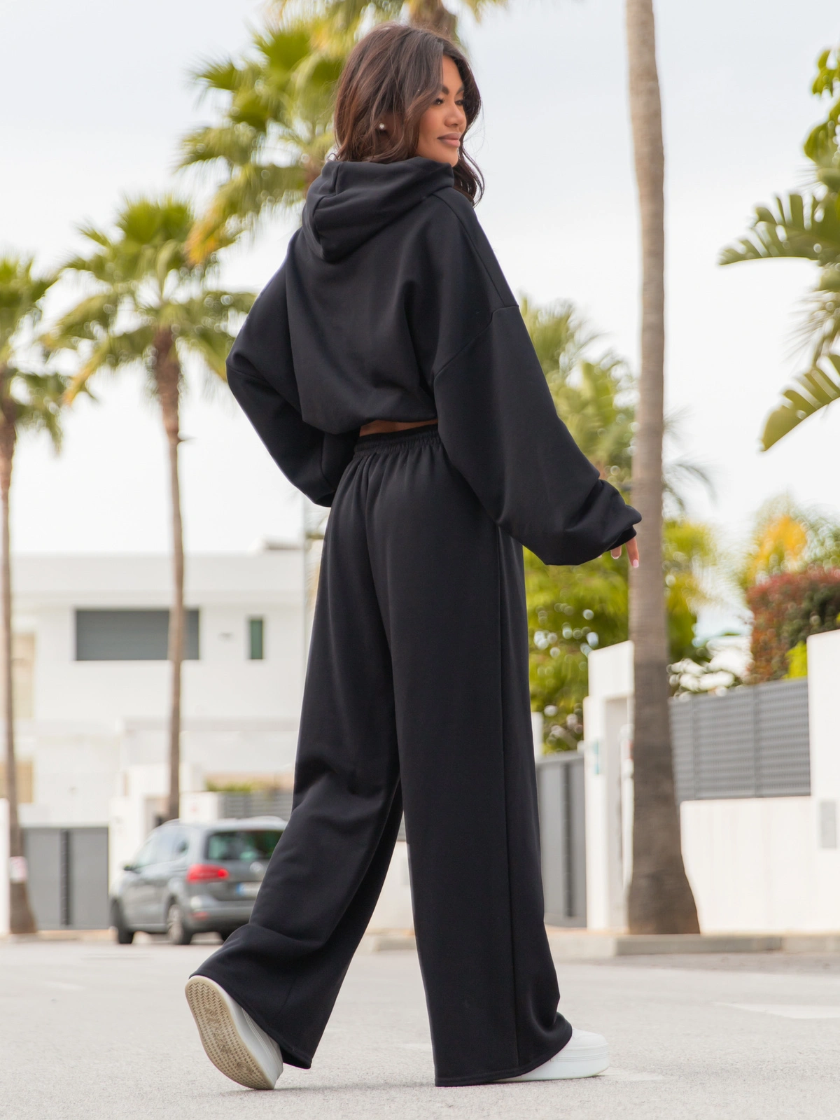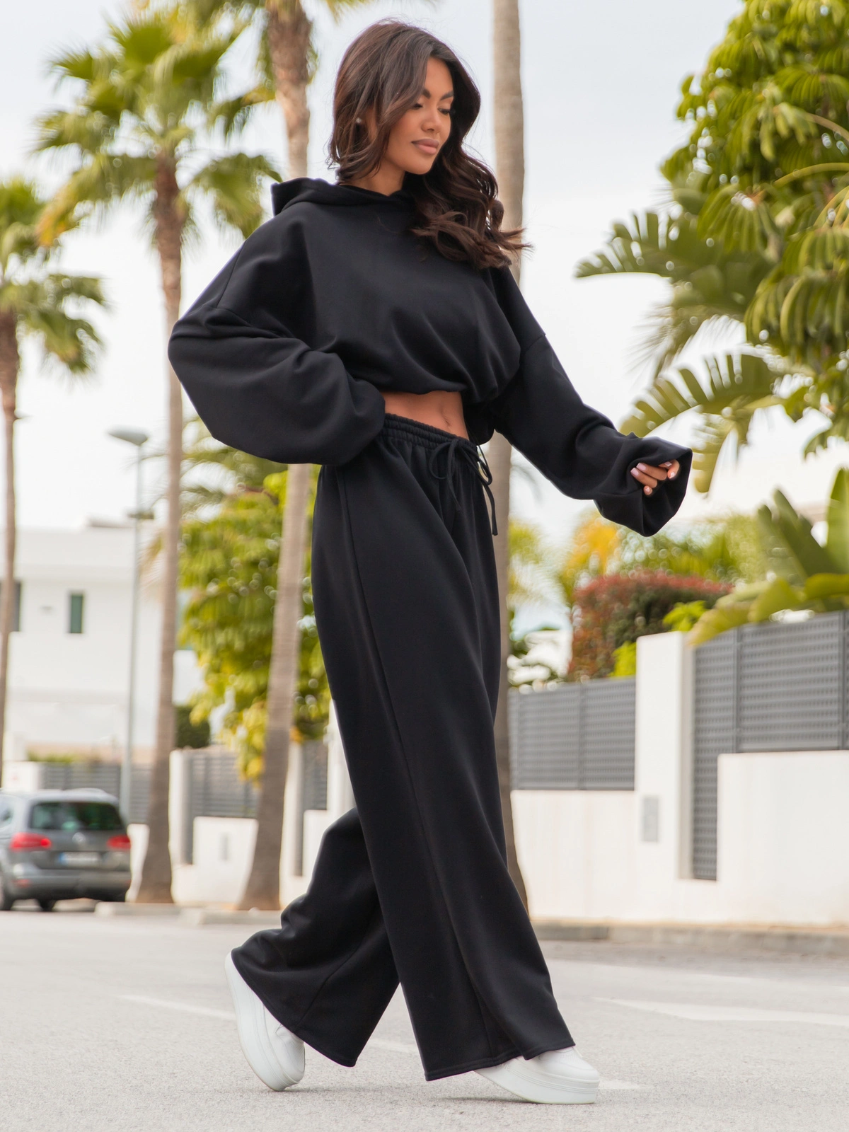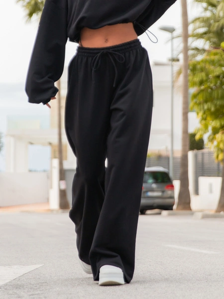 Luźne spodnie z gumką w pasie i dodatkowo wiązane, z szerokimi nogawkami. Uszyte z bawełnianej dzianiny dresowej. Materiał premium od polskiego producenta.