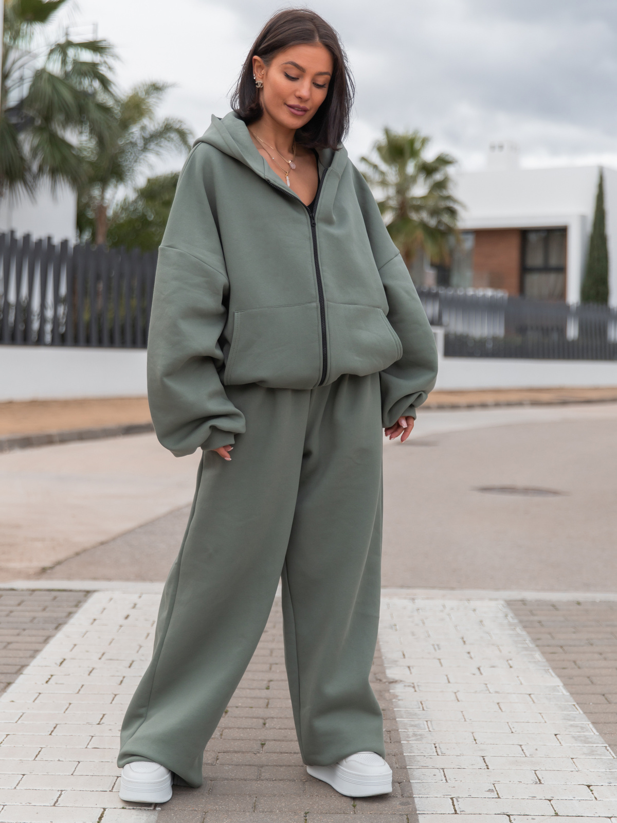 Dresowe bawełniane SPODNIE z szerokimi nogawkami khaki X31 k01