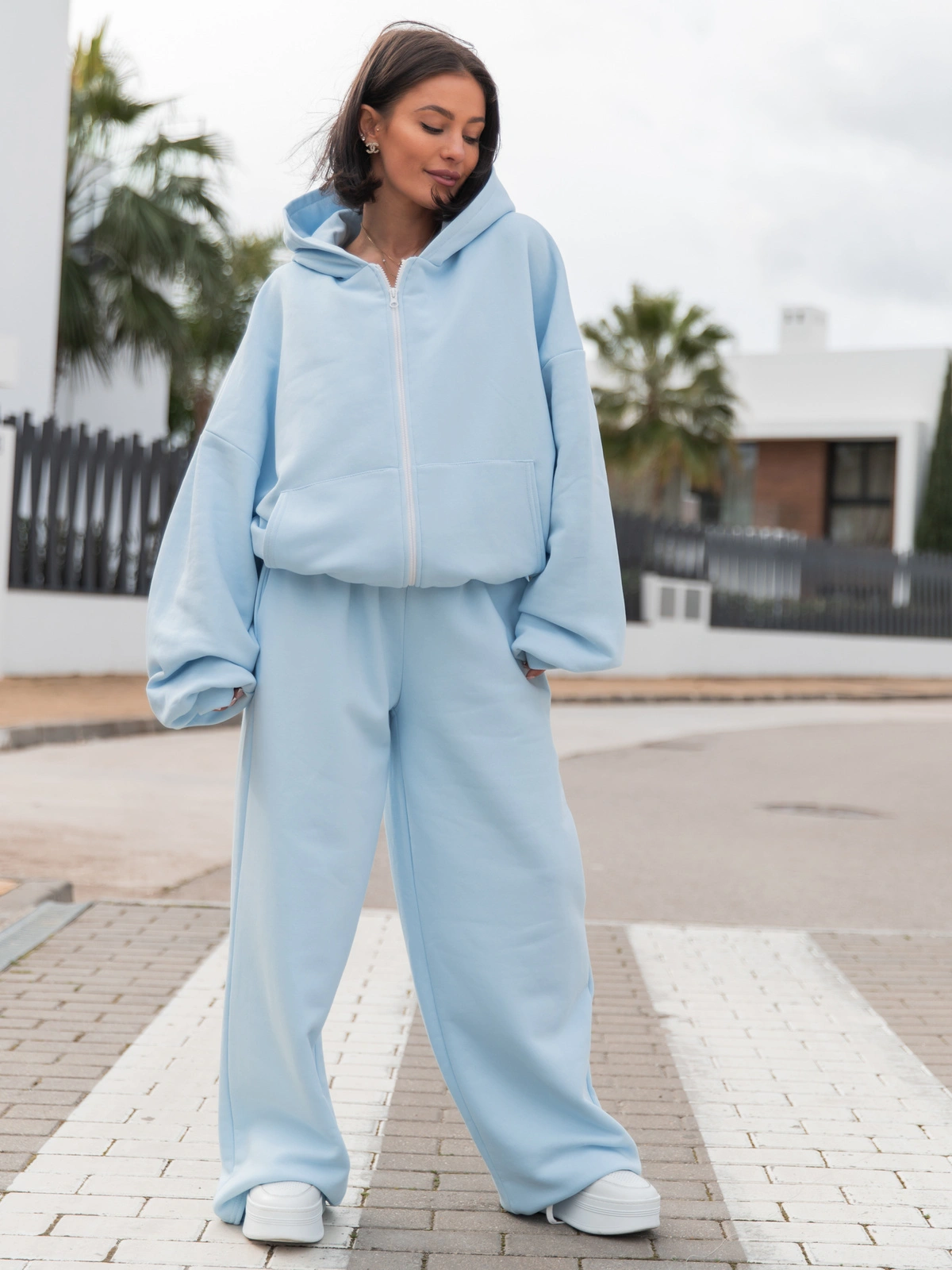 Dresowe bawełniane SPODNIE z szerokimi nogawkami baby blue X31 k01
