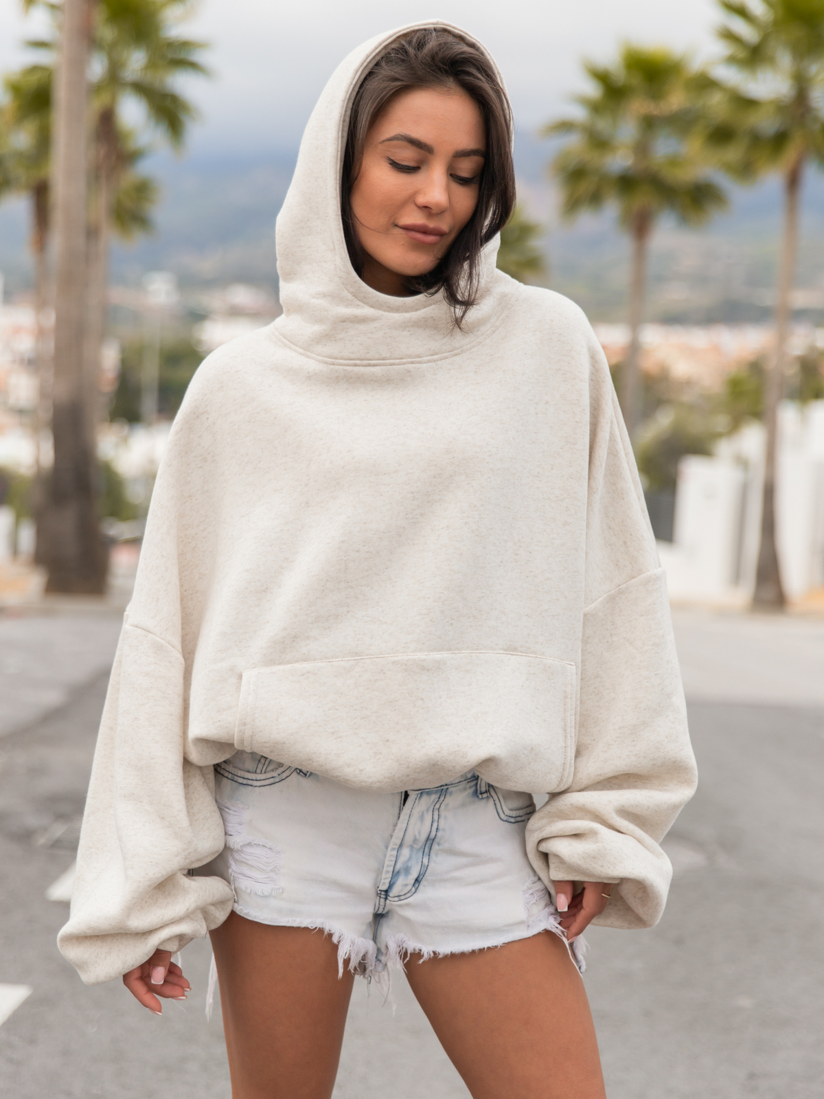 Viralowa Oversizowa BLUZA z kapturem bluzowana kangurka z bawełnianej dresówki z lnem beż melanż X2 k01