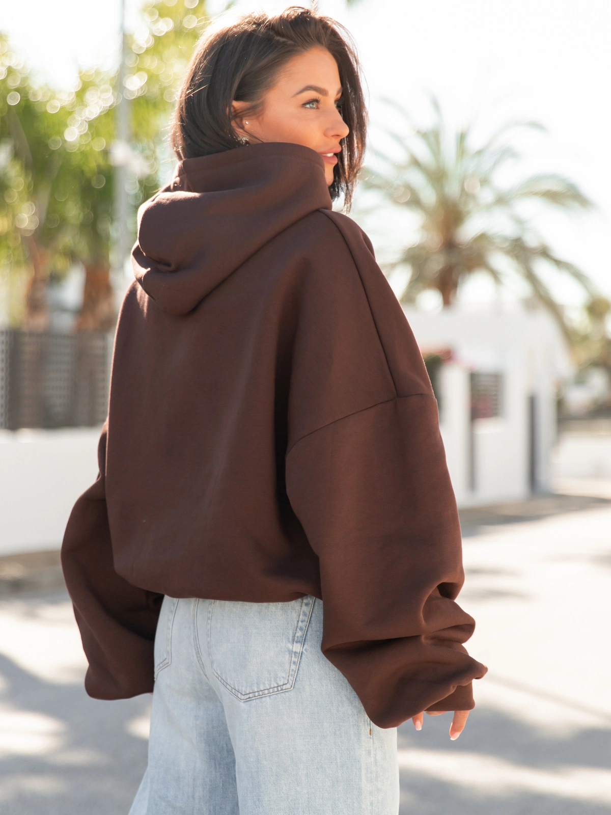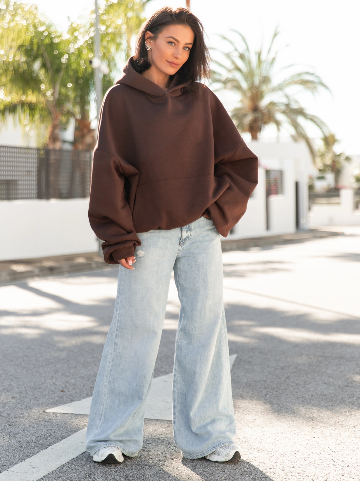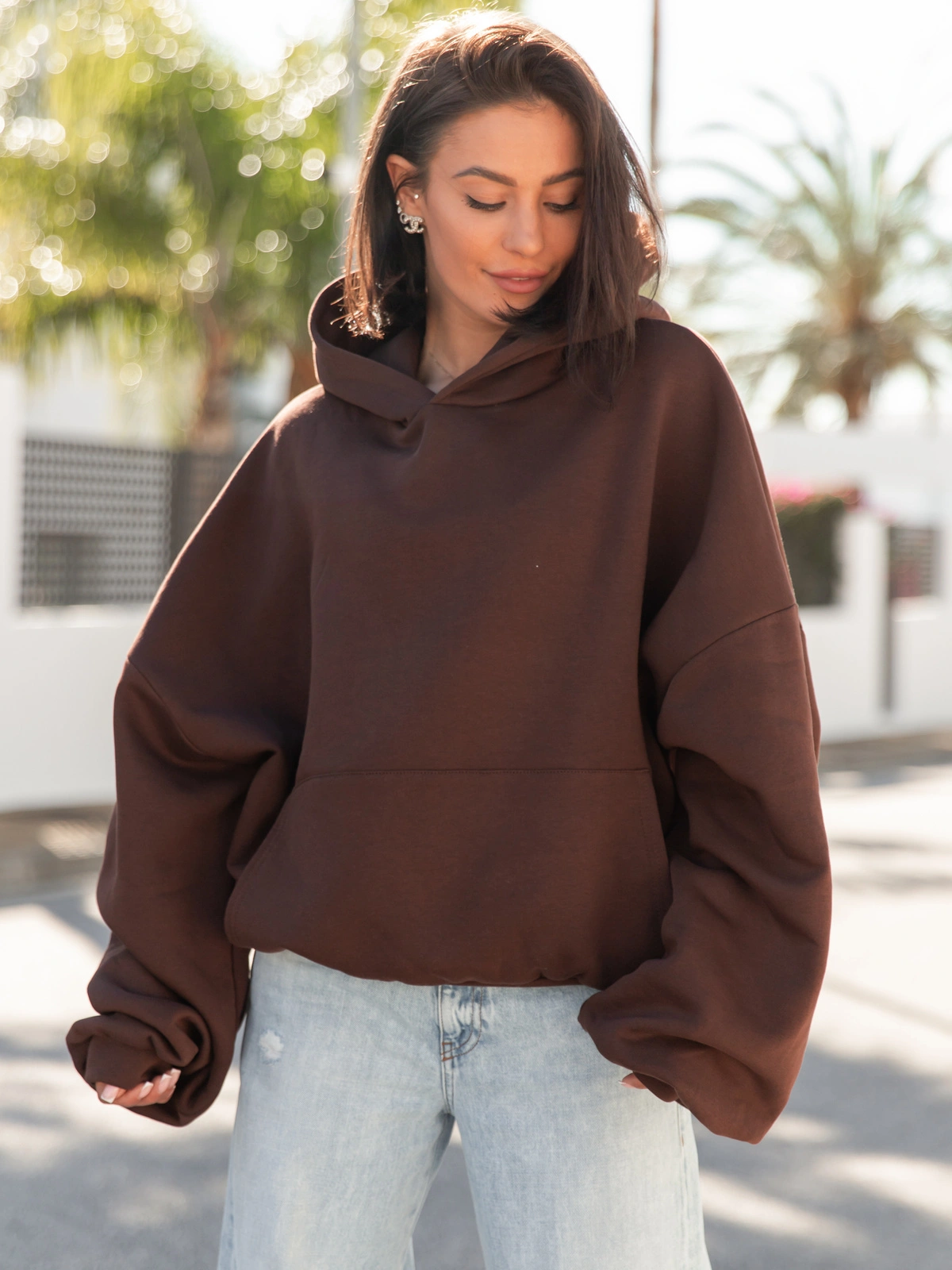 Opinie o Viralowa Dresowa bawełniana BLUZA z kapturem oversize szeroka brązowa E644