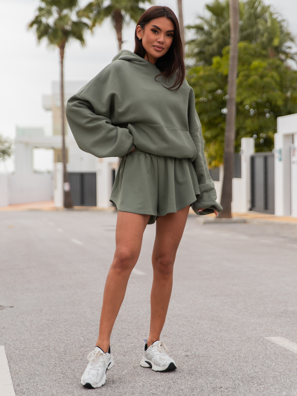 Bawełniany ZESTAW dresowy: bluza z kapturem E1 + asymetryczne szorty X53