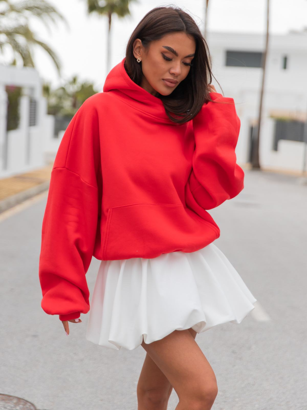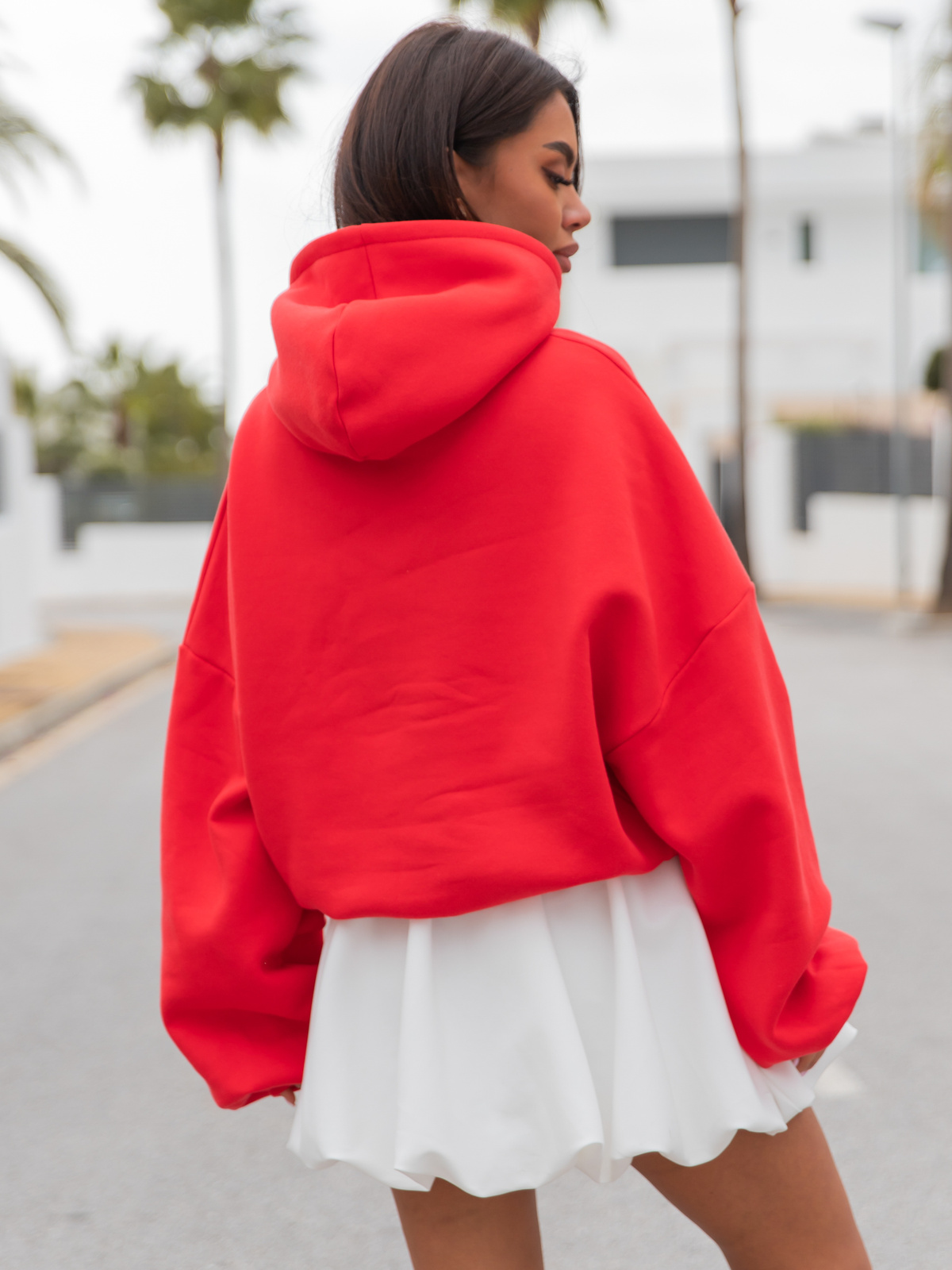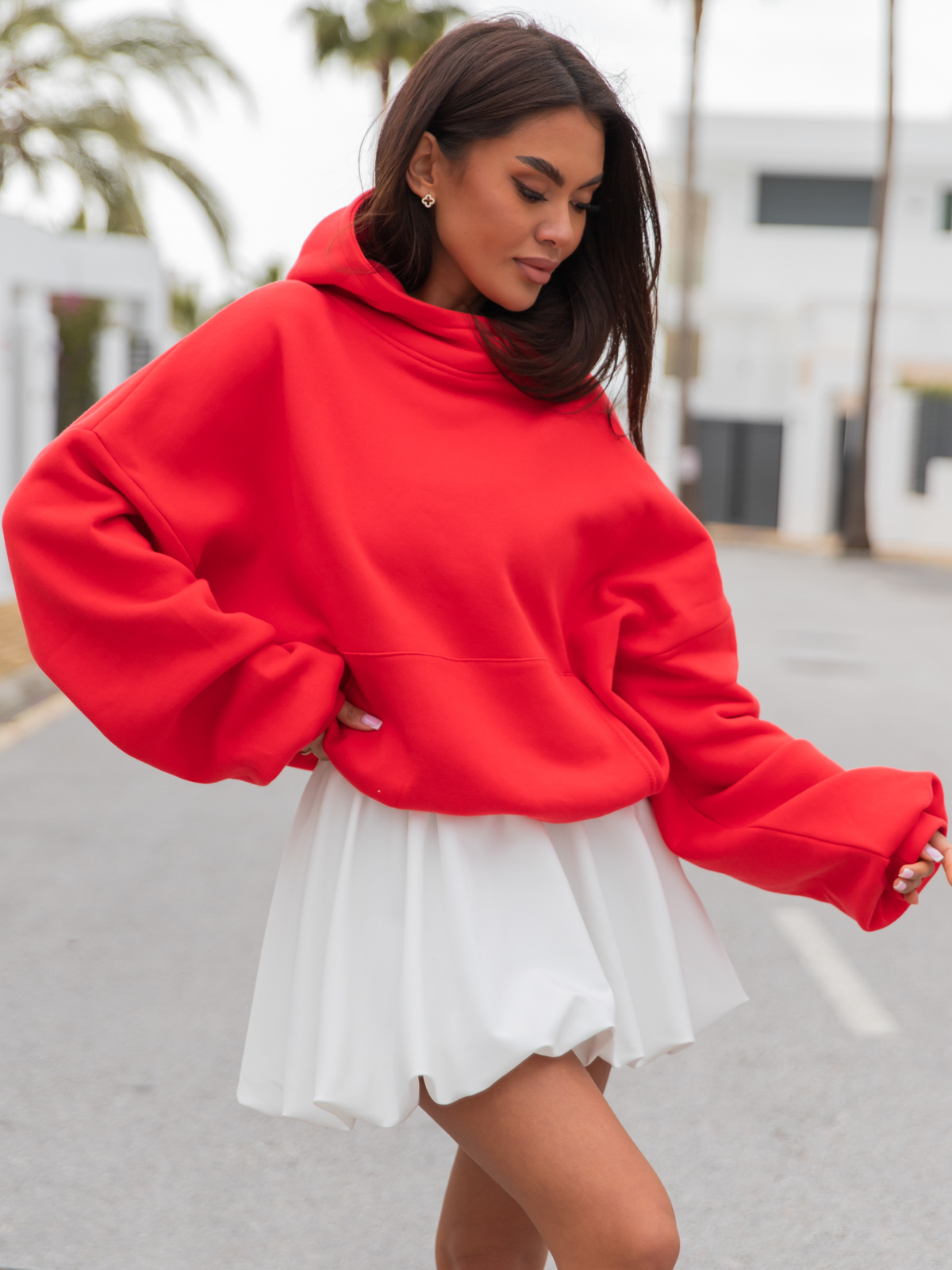 Oversizowa szeroka bluza kangurka z kapturem, ze ściągaczem umożliwiającym bluzowanie. Nasza viralowa bluza. Uszyta z bawełnianej dzianiny dresowej drapanej od wewnątrz, dzięki czemu jest przyjemny w noszeniu.