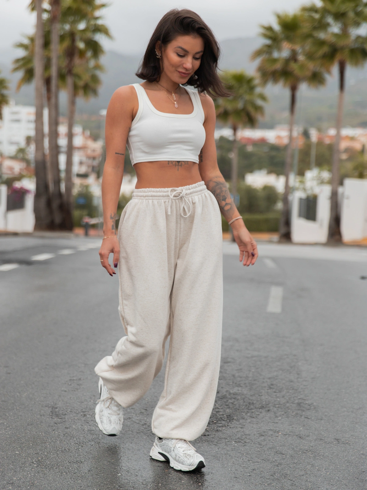 Luźne spodnie dresowe o kroju baggy , z gumką w pasie i dodatkowo wiązane . Z wysokim stanem , ze ściągaczami na nogawkach . Uszyte z dresowej bawełnianej dzianiny z dodatkiem lnu , melanżowy .