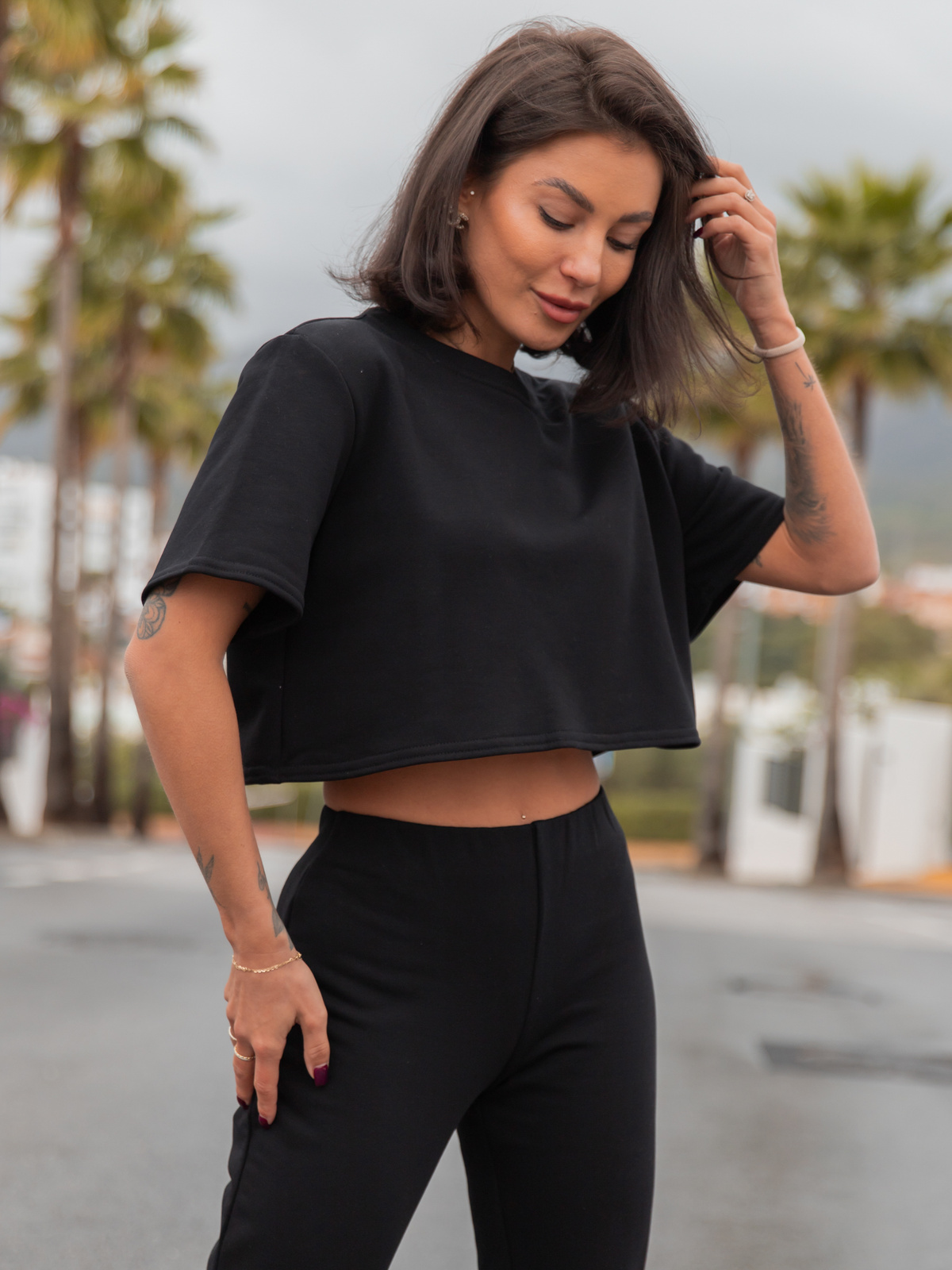 Oversizowy krótki t-shirt z krótkim rękawem . Uszyty z bawełnianej dzianiny dresowej. Materiał premium od polskiego producenta.