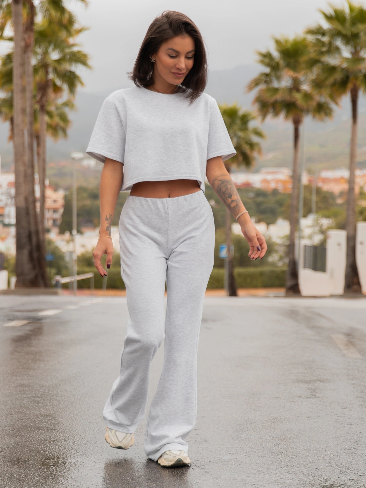 Spodnie dopasowane na udach i biodrach , z rozszerzaną nogawką na dole , z wysokim stanem .Uszyte z bawełnianej dzianiny dresowej. Materiał premium od polskiego producenta.