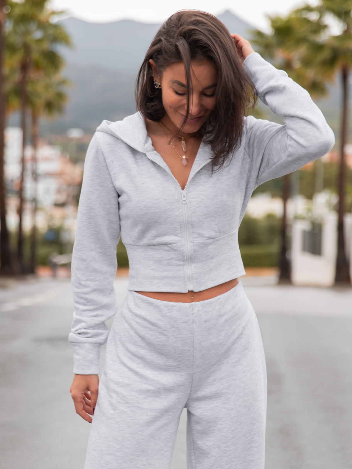 Bawełniana krótka dopasowana BLUZA dresowa z kapturem na zamek szary melanż X58 k01